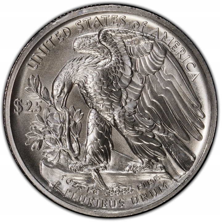 Во-вторых, цена находится между двумя другими монетами «Орел США», которые в настоящее время производятся на Монетном дворе США — «Золотой орел США» и «Золотой орел США». Серебряный Орел. В-третьих, использование популярной конструкции «Крылатая свобода» Адольфа А. Вайнмана будет фактором притяжения. Работа Вайнмана также изображена на реверсе монеты, хотя у нее гораздо менее известный мотив. В основу легла его медаль, которая была разработана для Американского института архитекторов в 1907 году и изображает изображение орла. Палладиевые орлы выпускаются всеми филиалами Монетного двора США, кроме Вест-Пойнта.