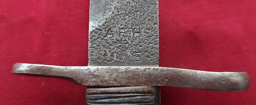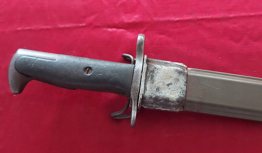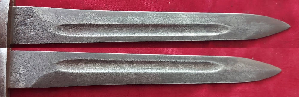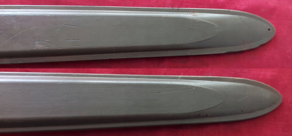 Копия, видимая на фотографиях. Черный клинок. На пороге лезвия виден каша, что делает подписание на пороге лезвия. Пластическая облицовка, один из них имеет фрагмент, остальное - оригинальное. Штыковые замки.