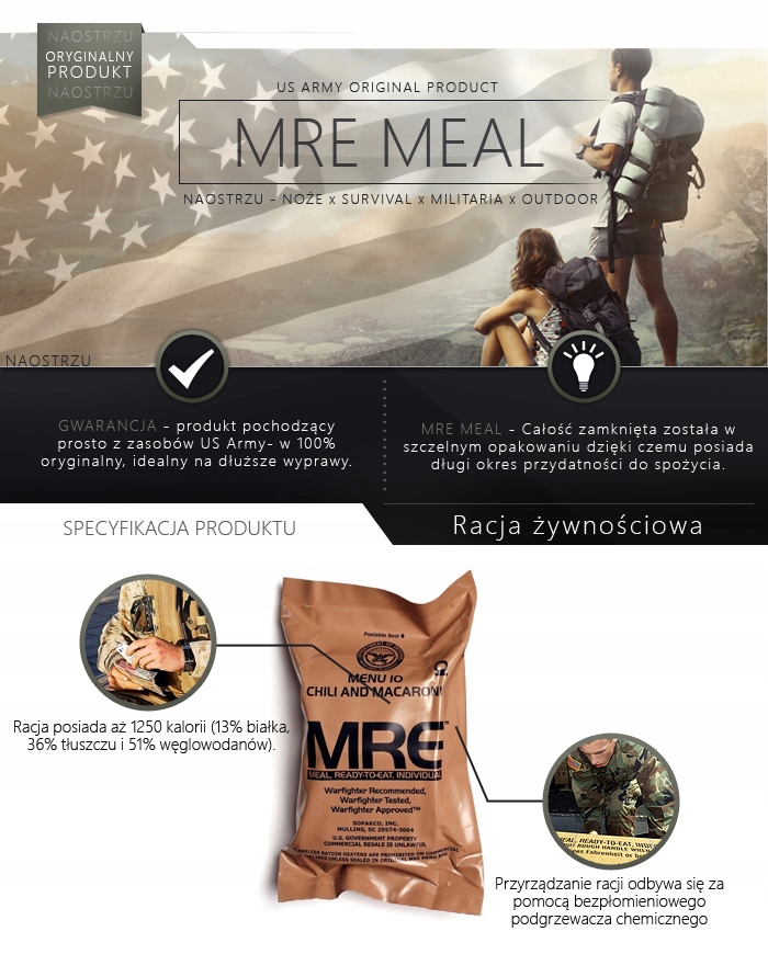 Оригинальный пищевой рацион армии США Mre (еда, готовая к употреблению) является идеально запланированным набором, составленным для одного человека, готового к употреблению в всех условиях. целое закрыто в жесткой упаковке , которая гарантирует длительный срок годности для потребления, и каждый продукт внутри имеет отдельную упаковку, обеспечивая свежесть и запах.