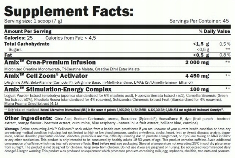 Доставка перед тренировкой содержит три комплекса инфузии Crea-Remium Amix ™, активатора Amix ™ Cellzoom® и ингредиентов Amix ™ стимуляции-энергии, которые представляют собой смеси, включая креатин, аминокислоты и экстракты, гарантирующие удивительные, проверенные свойства Cellzoomcore.