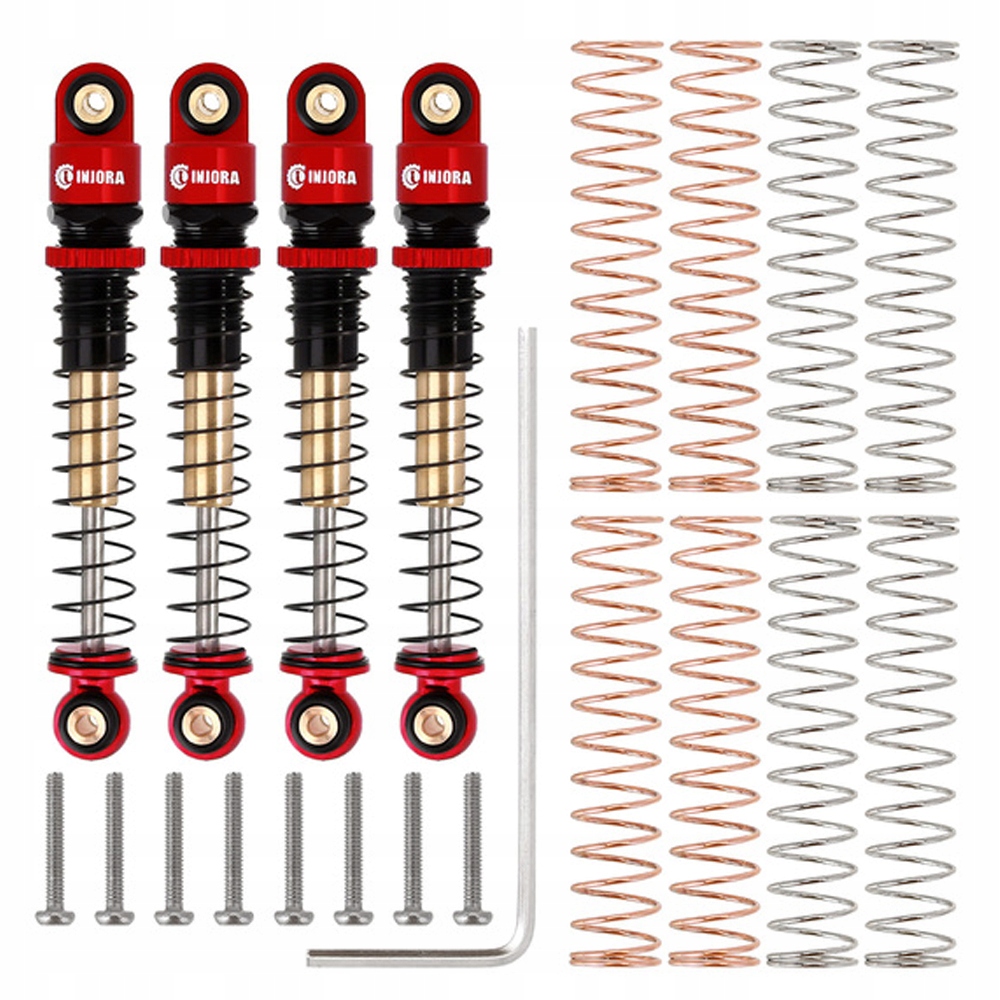ХАРАКТЕРИСТИКИ ПРОДУКТА: количество в наборе: 4 комплекта цвет: красный Марка: INJORA длина: 43 мм (расстояние между отверстиями) материал: алюминий применение: Axial SCX24 AXI90081 Ригель Micro Crawler В КОМПЛЕКТ ВХОДИТ: 4 амортизатора в сборе 12 пружин 8 винтов 1 ключ
