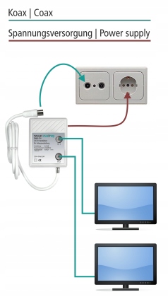 Axing TVS 8-01 используется для подключения двух устройств к одному антеннному розетку с электроснабжением электроэнергии