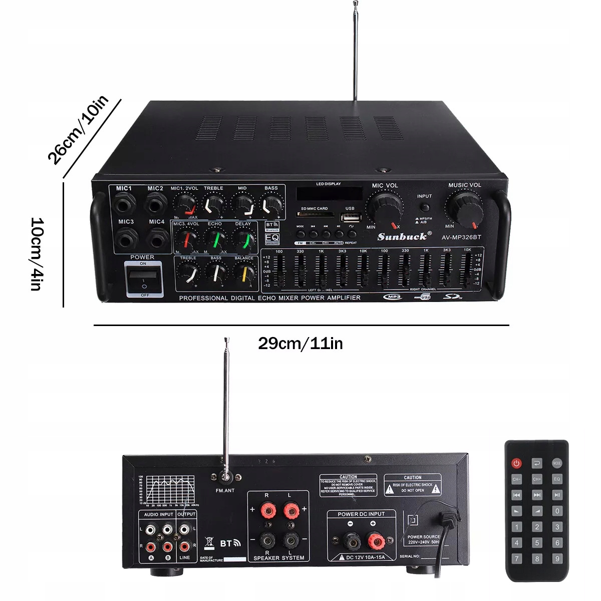 • 🎤 5 Необязательные входы: Цифровой усилитель поддерживает интерфейс USB/SD -карту с емкостью макс. 64 ГБ/FM/Bluetooth Radio/4 входы микрофона, DC 12 В и AC 110 В/220 В, сигнал DVD и AUX -сигнал.