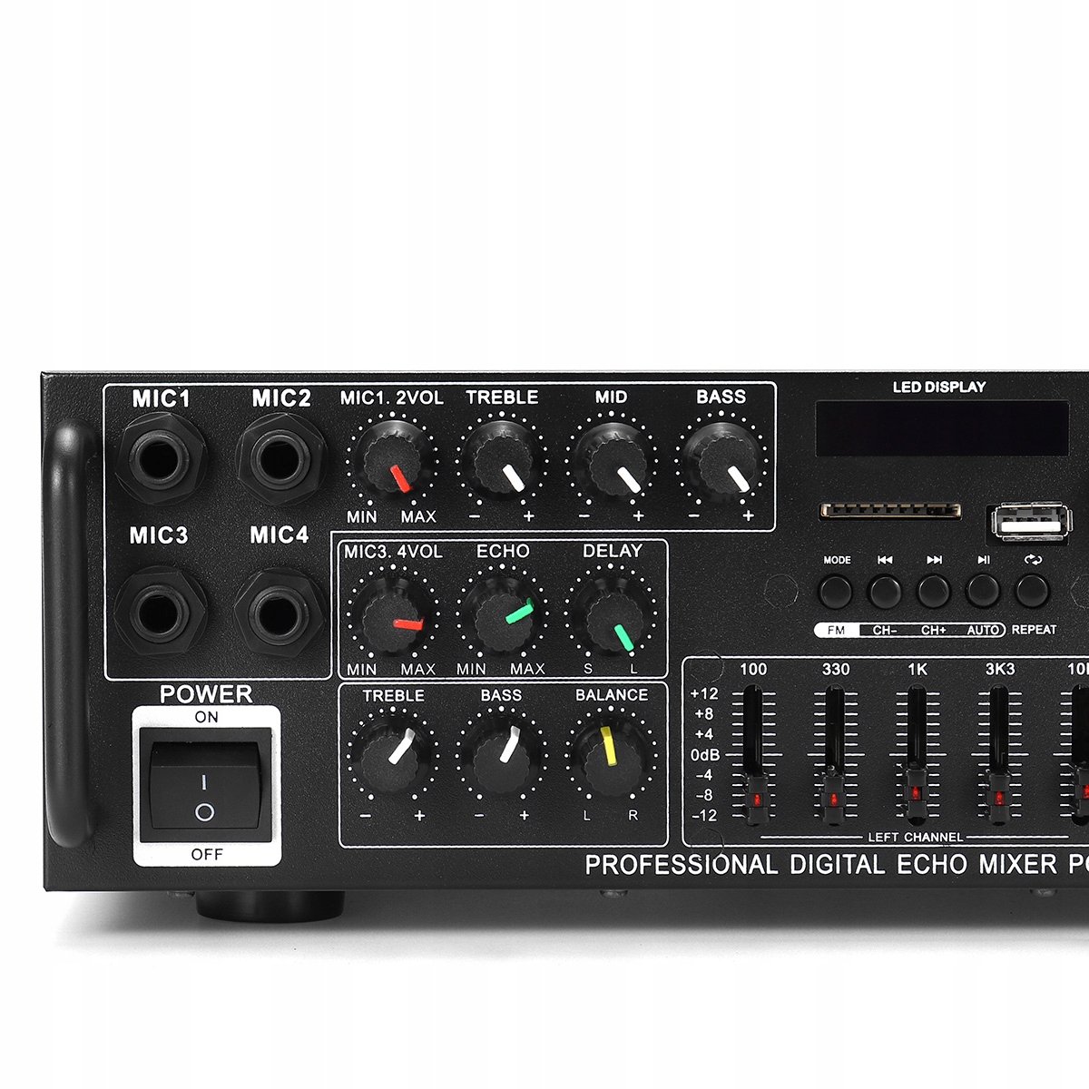 - -Полнофункциональный, с Bluetooth 5.0, с FM-радио, со светодиодным дисплеем, с входом 12 В постоянного тока, с 4 микрофонными входами, с микрофоном для управления реверберацией и задержка, оснащенная функцией 5-полосного эквалайзера