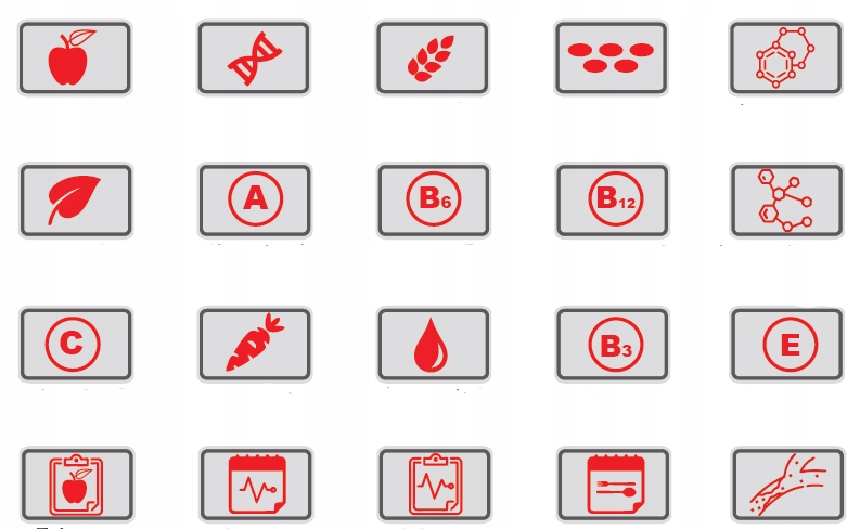 Приложение AiFresh отображает содержание питательных веществ в [г] потребляемых продуктов: включая калории, белки, жиры, углеводы, клетчатку, витамины, каротин и т. д. В всего 24 различных питательных вещества.