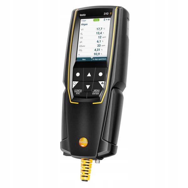 Testo 310 II EN имеет две измерительные камеры для O2 и CO, а также датчик температуры, встроенный в зонд выхлопных газов. Газовые датчики измеряют точное содержание кислорода и угарного газа, а также температуру выхлопных газов и окружающей среды. На основе этих данных рассчитываются все соответствующие параметры измерения, такие как значение CO2, уровень эффективности и потери с выхлопными газами. Кроме того, сильными сторонами измерительного прибора являются точность измерений, настраиваемый дисплей измерений, возможности параллельного измерения, интуитивно понятное управление, прочный корпус, возможность подключения к testo SmartApp: наш анализатор дымовых газов testo 310 II EN предлагает все, что нужно профессионалам в области отопления для практической работы с системами отопления.