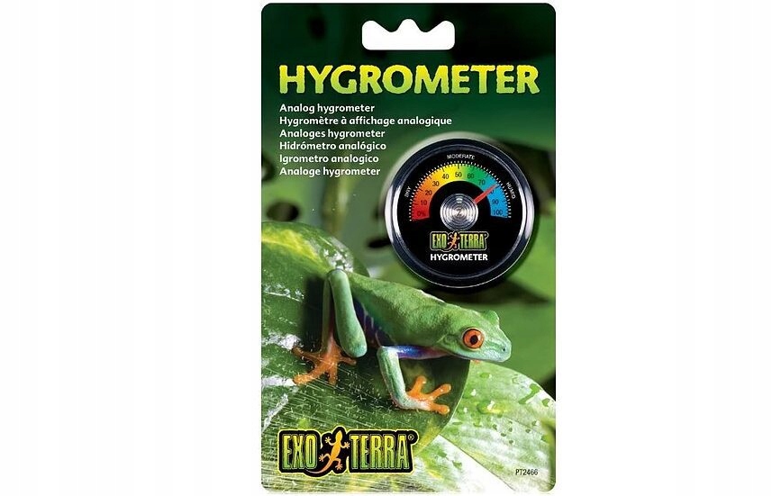 Прибор используется для измерения влажности в аквариуме, отлично подходит для рептилий для контроля соответствующих показателей. Часы Exoterra крепятся на самоклеящуюся ленту, что гарантирует безопасную и прочную установку устройства. Шкала имеет точное деление (каждые 2%) и цвета, информирующие об условиях внутри шкафа. Этот продукт является одним из самых надежных устройств, доступных на рынке.
