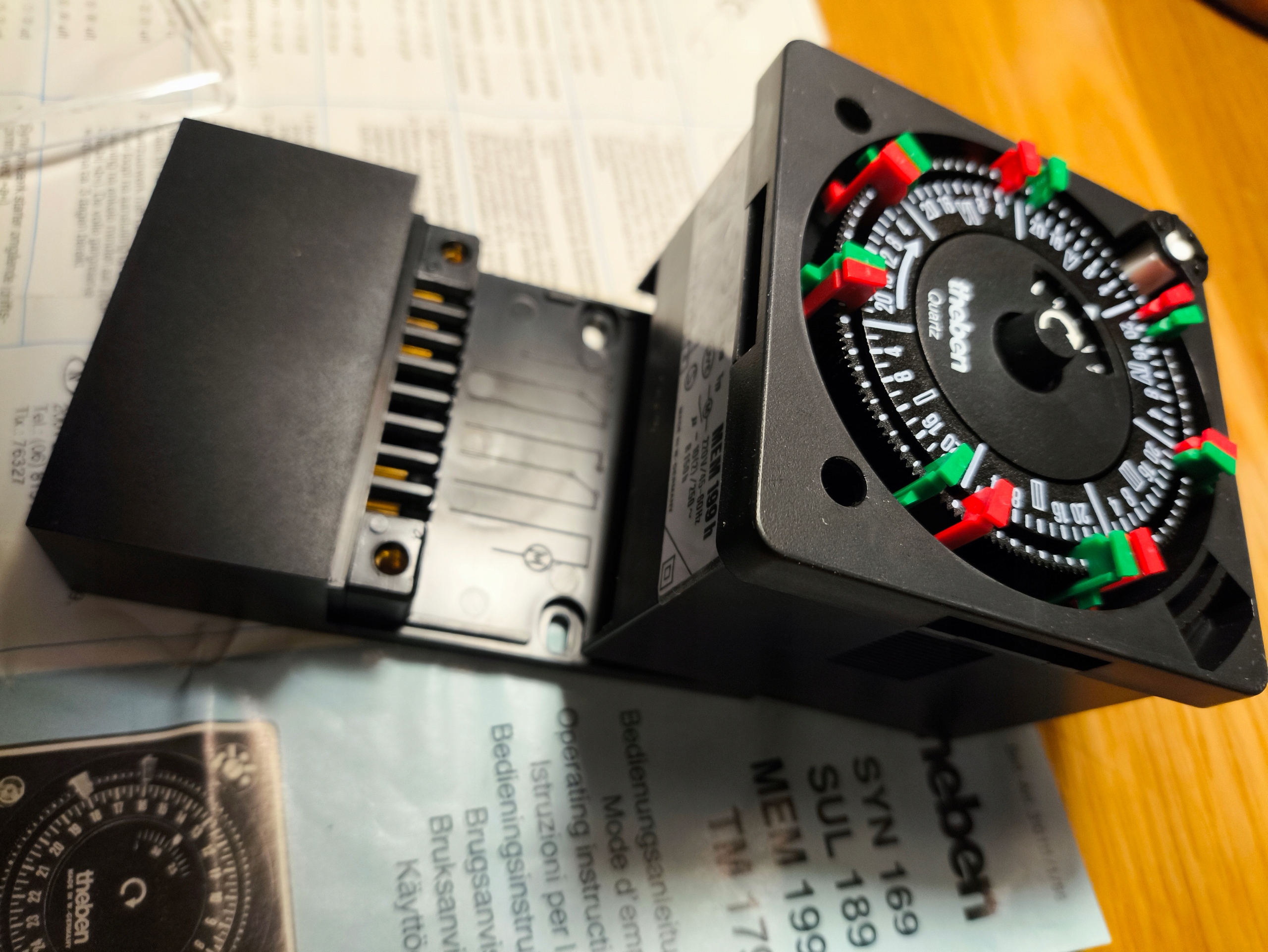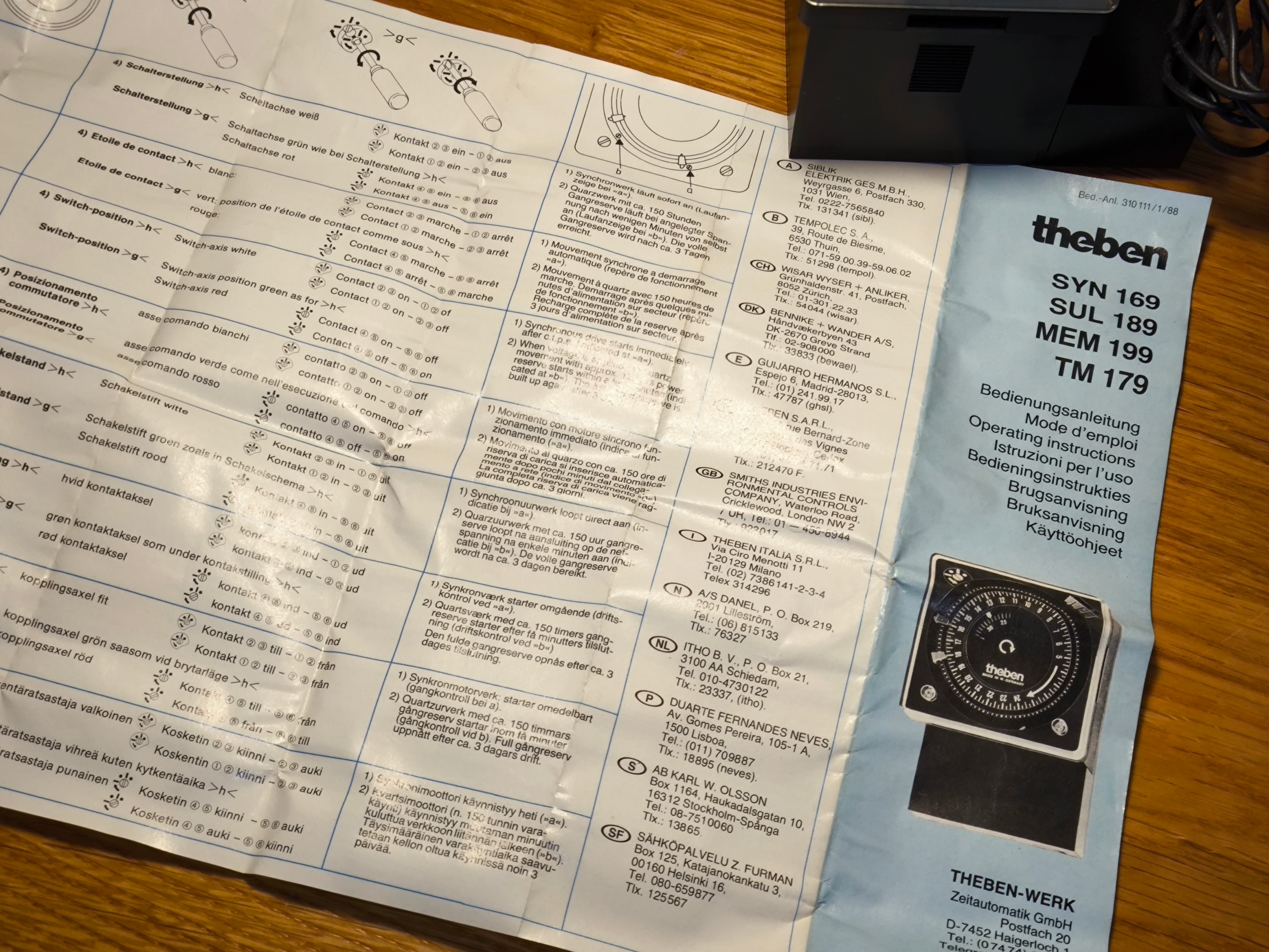 Общее описание Theben MEM 199 h — аналоговый недельный таймер, произведенный в Федеративной Республике Германия (Западная Германия) в конце 1980-х годов. Входящая в комплект инструкция датирована «11.11.88», что подтверждает, что серия выпущена в 1988–1989 годах. Устройство предназначено для автоматического управления электрическими цепями по запрограммированному недельному графику (7 дней). В модели MEM 199 h используется классический таймер с сегментами для установки периодов включения и выключения.