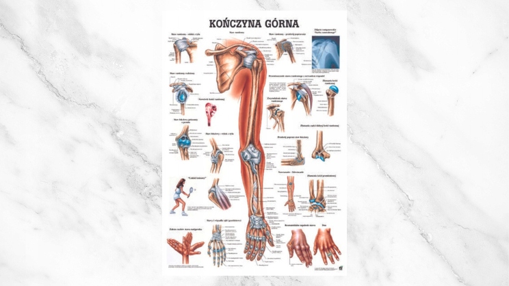 Анатомическая плата b> с изображением верхней конечности человека. Он содержит четкую маркировку в польском . Это образованная образовательная помощь при изучении анатомии человека.