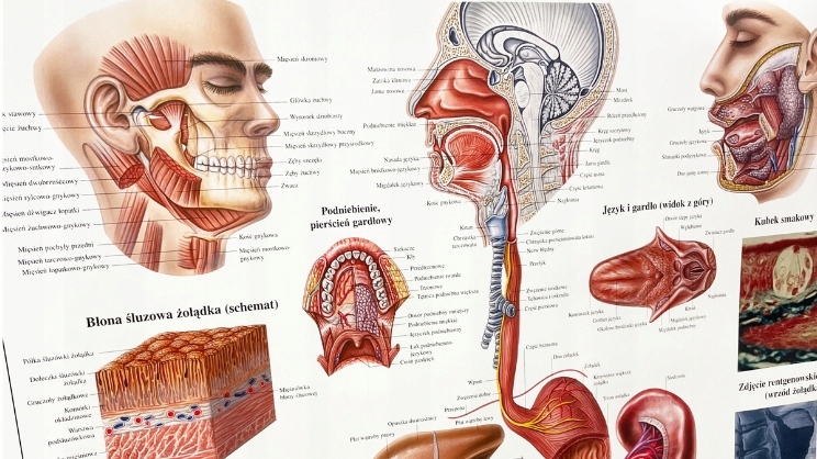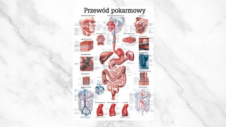 Анатомическая таблица Показывает пищеварительный тракт человека . Он содержит четкую маркировку в польском . Это отличная образовательная помощь во время изучения анатомии человека.