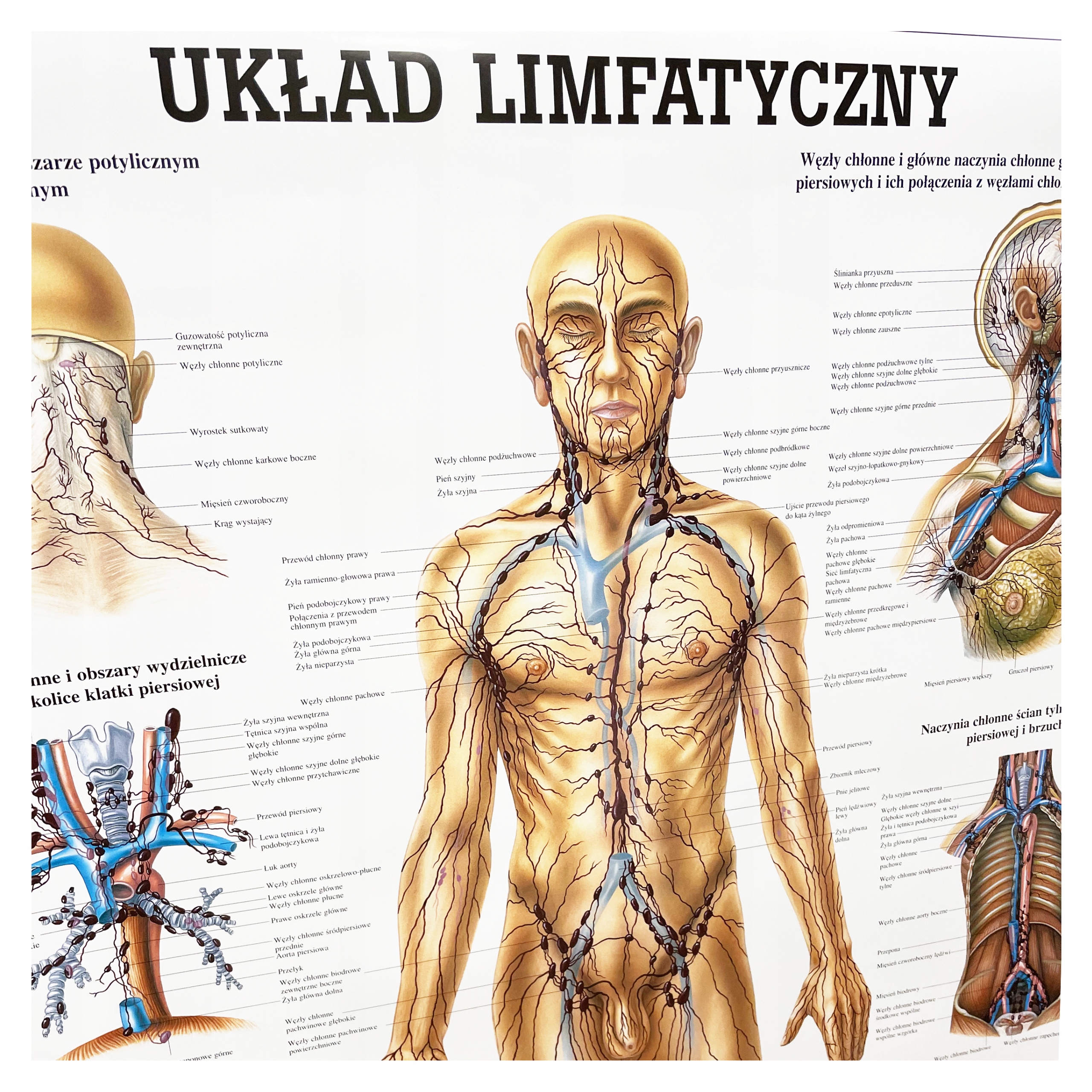 Анатомическая доска, показывающая лимфатическую систему человека. Содержит разборчивую маркировку на польском языке. Это отличное учебное пособие при изучении анатомии человека.