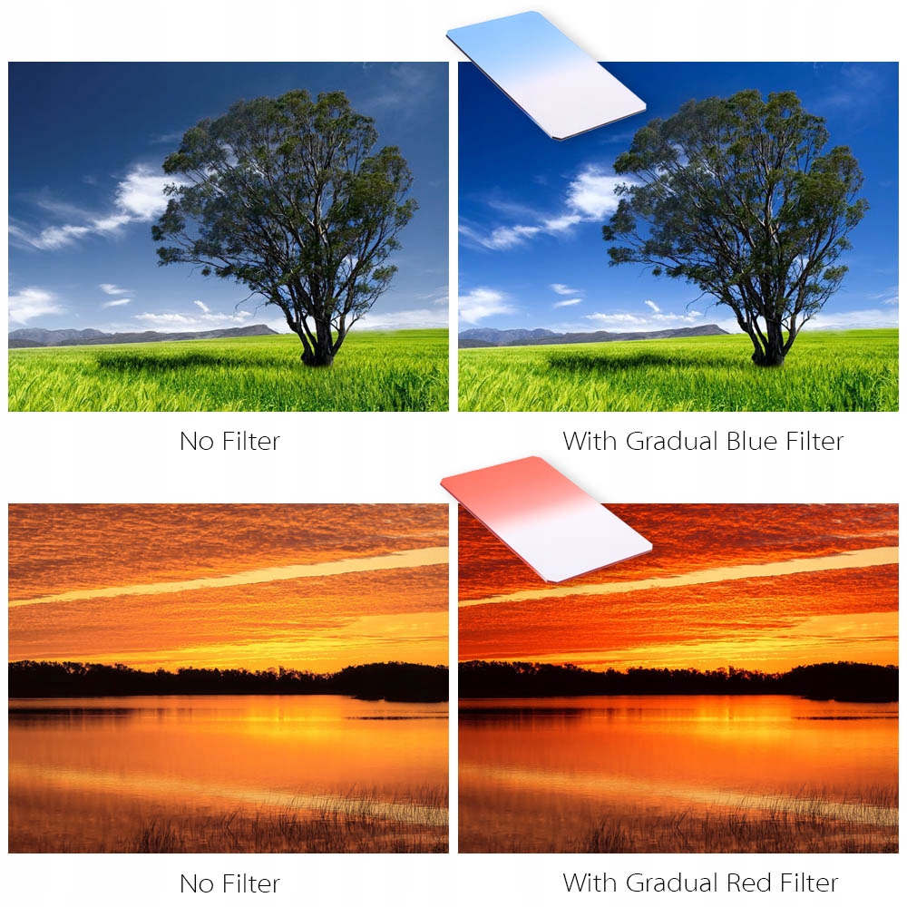 10. 7 градуированных цветных фильтров (желтый, оранжевый, синий, фиолетовый, зеленый, красный и темно-коричневый) обеспечивают постепенный переход цвета для плавного и плавного эффекта растушевки. 3 шт. градиентного нейтрального фильтра для уменьшения света и баланса цвета. 3 фильтра Full ND уменьшают количество света, попадающего на пленку, не влияя на цвет.