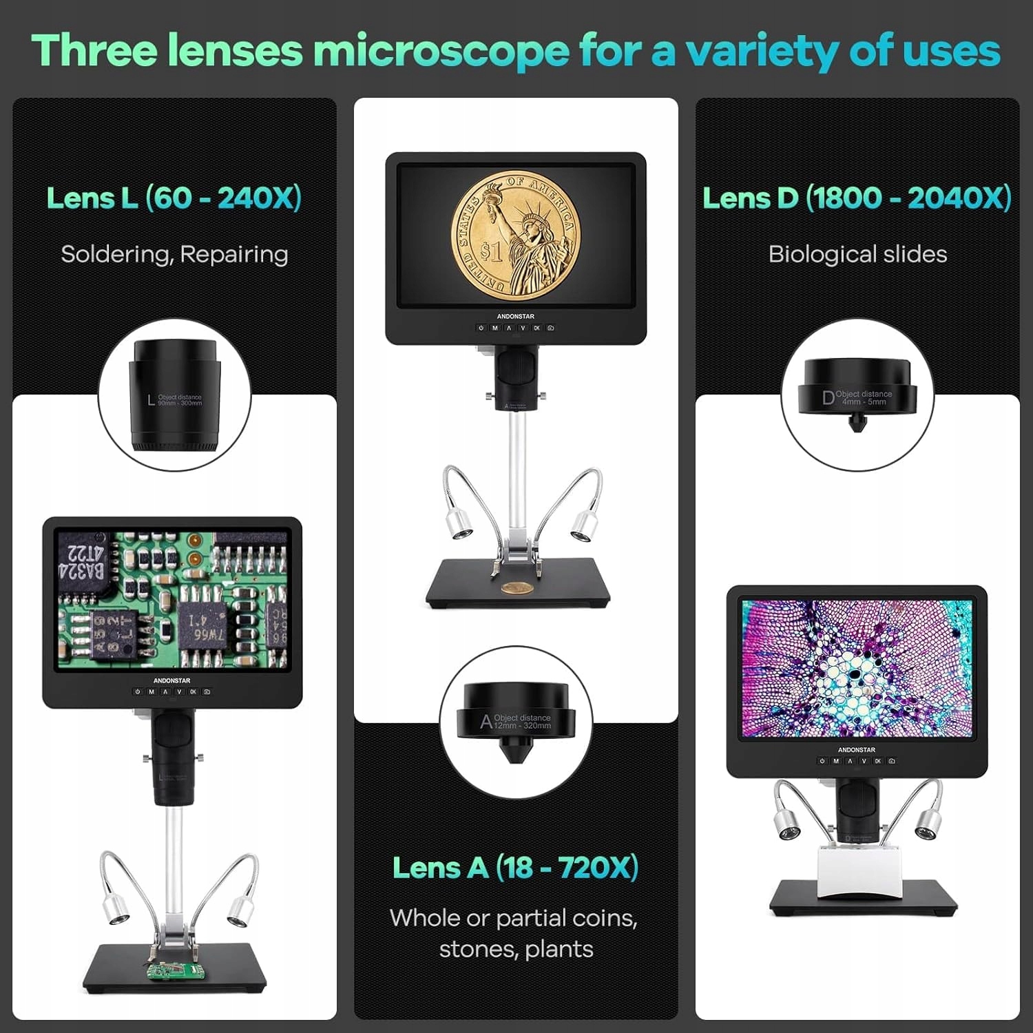 andonstar ad249s-m цифровой микроскоп 10 "60-240x 18-720x 1560-2040 USB HDMI H2>