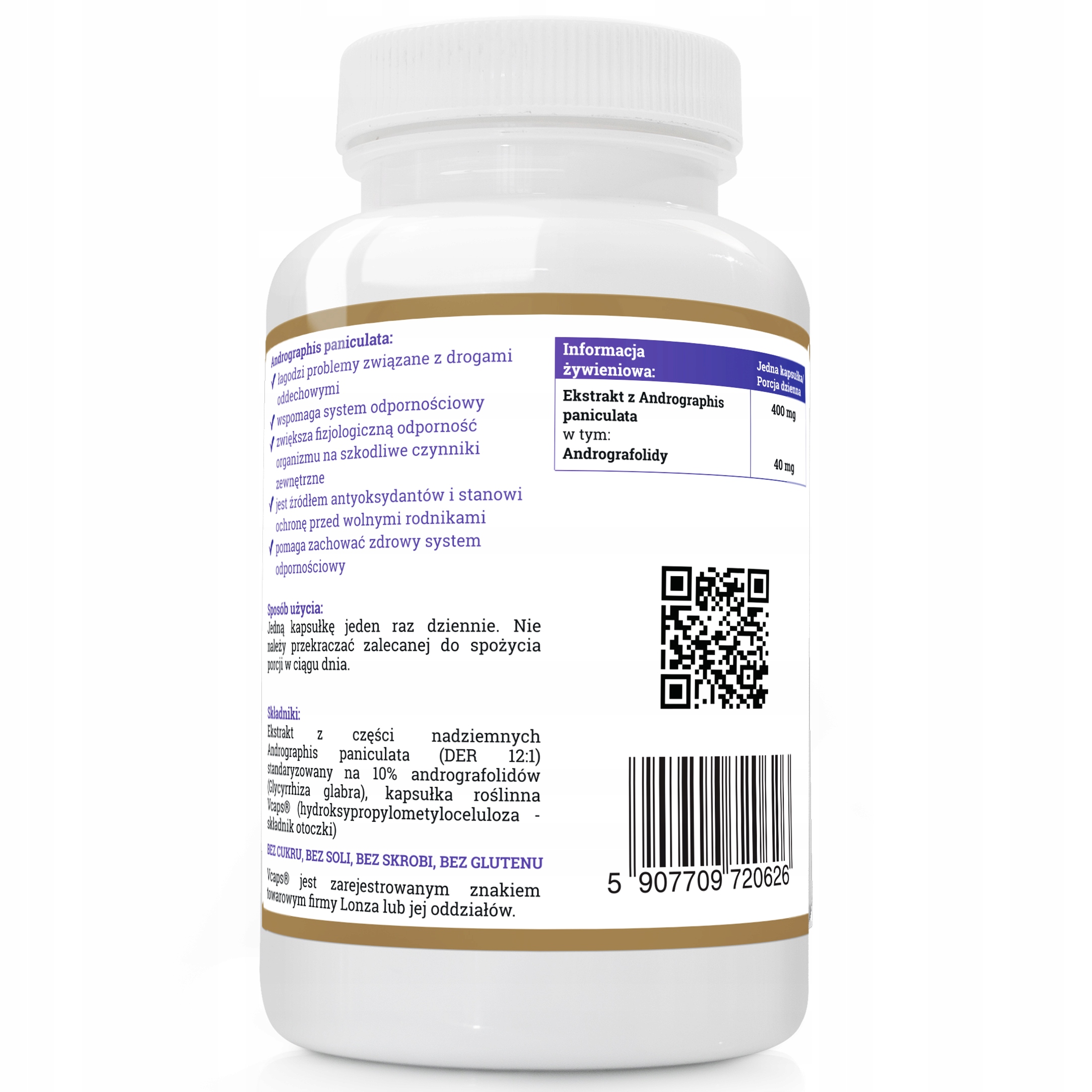 ИНГРЕДИЕНТЫ: Экстракт надземных частей Andrographis метельчатой (DER 12:1), стандартизированный до 10 % андрографолидов (Glycyrriza glabra), растительная капсула Vcaps® ( гидроксипропилметилцеллюлоза, покрывающий ингредиент)