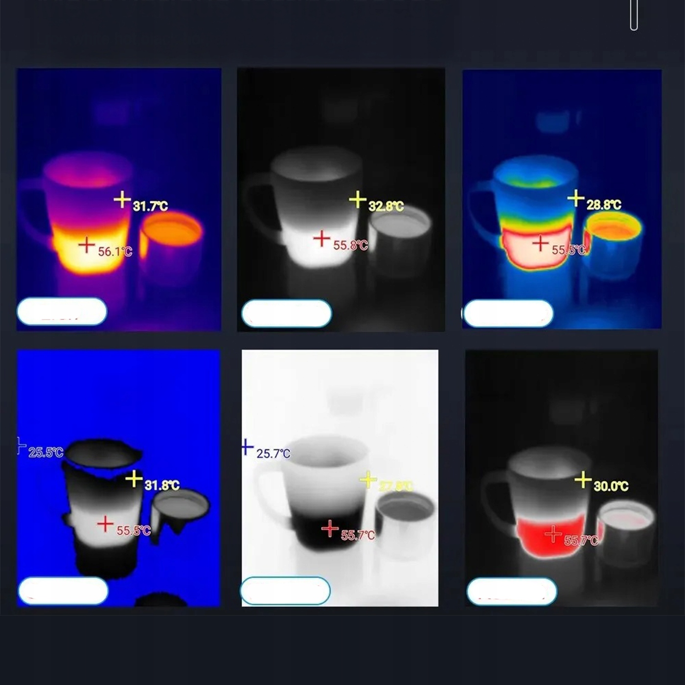 - Выбор из шести цветных поддонов (железо, белое горячее, черное горячее, радуга, красная горячая, холодная синяя), чтобы регулировать визуализацию для различных испытательных потребностей.