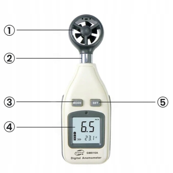Анемометр - также называемый анемометром, представляет собой прибор, используемый для измерения движения газов. Наше устройство представляет собой крыльчатый анемометр, название которого обусловлено его конструкцией, точнее, 6-плечим ротором, который начинает вращаться за счет потока газа. Обороты ротора регистрируются счетчиком, который затем определяет скорость воздуха. Данные, собираемые устройством, отображаются на ЖК-дисплее в удобной для пользователя форме.