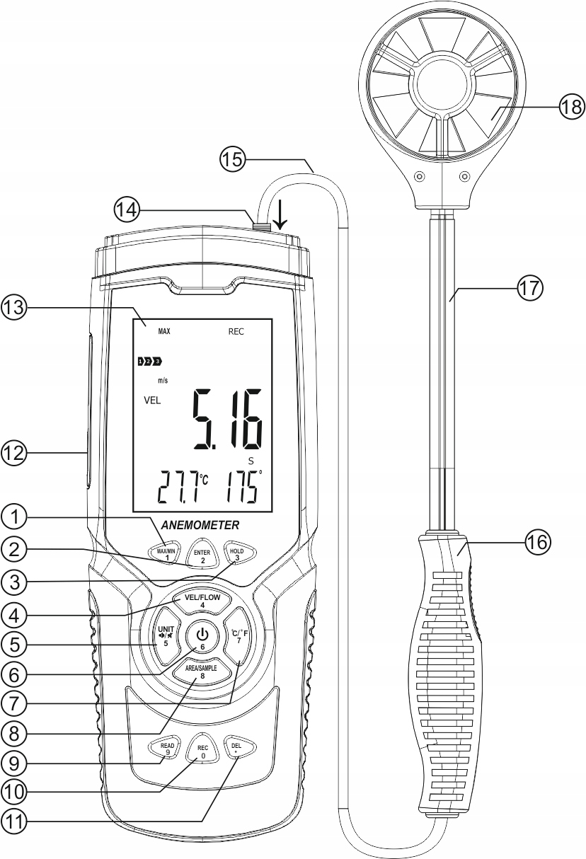 Кнопка 1 переключает режимы MAX/AVG/MINКнопка 2 для подтверждения ВВОД Кнопка 3: Удержание результата измерения (УДЕРЖИВАТЬ)Кнопка 4: переключение между скоростью и расходом воздуха Кнопка 5: короткое нажатие — изменение единицы измерения (UNIT), длительное нажатие включает/выключает звук клавиатуры.Кнопка 6: включено , короткое нажатие, чтобы включить/выключить подсветку, нажмите и удерживайте, чтобы выключить устройство.Кнопка 7: нажмите, чтобы изменить единицы измерения температуры ℃/℉, нажмите и удерживайте, чтобы выбрать измерение температуры или влажности.Кнопка 8: установка площади потока (AREA), интервала записи данных (SAMPLE), считывание номера записи. Кнопка 9: вход в режим чтения/записи/регистрации данных.Кнопка 0: записывает одну опорную точку или входит в интерфейс регистрации данных (REC). .Кнопка: сохранение фрагмента данных или вход в интерфейс записи данных.USB-интерфейсЖК-дисплей .Разъем (совместите с отверстием разъема при подключении датчика↓). Соединительный кабель. li>Эргономичная рукоятка датчика.Регулируемая длина шейки датчика Шестилопастной вентилятор.