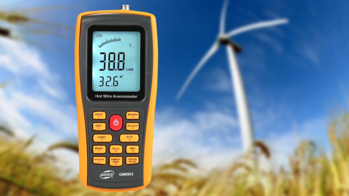 Точный и компактный Термоанемометр Benetech для измерения скорости ветра, температуры и расхода воздуха с возможностью подключения к компьютеру через USB-порт.