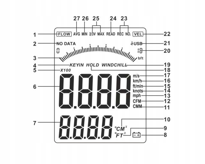 - Единица измерения: CFM (м³/мин) | Диапазон: 0–999900 | Разрешение: 0,001–100 | Площадь: 0,001-9999