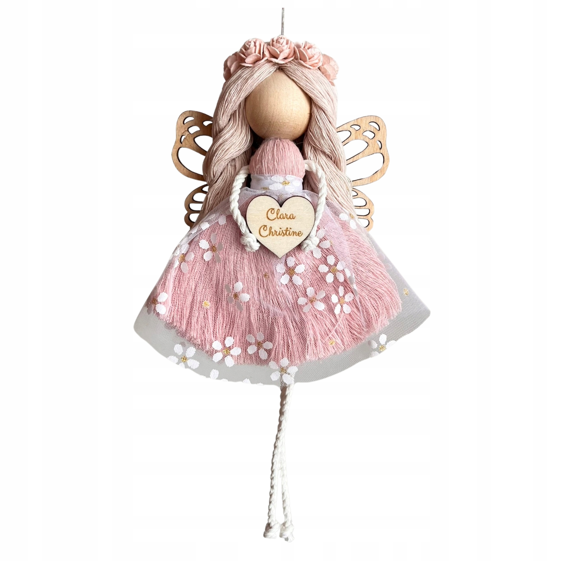 Ангел аккуратно изготовлен из розовой нити, из которой вплетено элегантное платье, украшенное тюлем и очаровательными цветами. Светлые волосы феи изящно уложены, а розовый венок, похожий на нимб, придает ей ангельский вид. В руках он держит сердце, на котором я могу выгравировать особенный для вас текст.