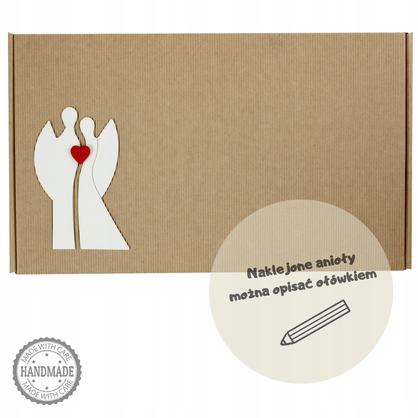 - Декоративная рифленая шкатулка, наполненная древесной шерстью, с эмблемами тех же ангелов, которые входят в комплект. и сердце из фетра.
