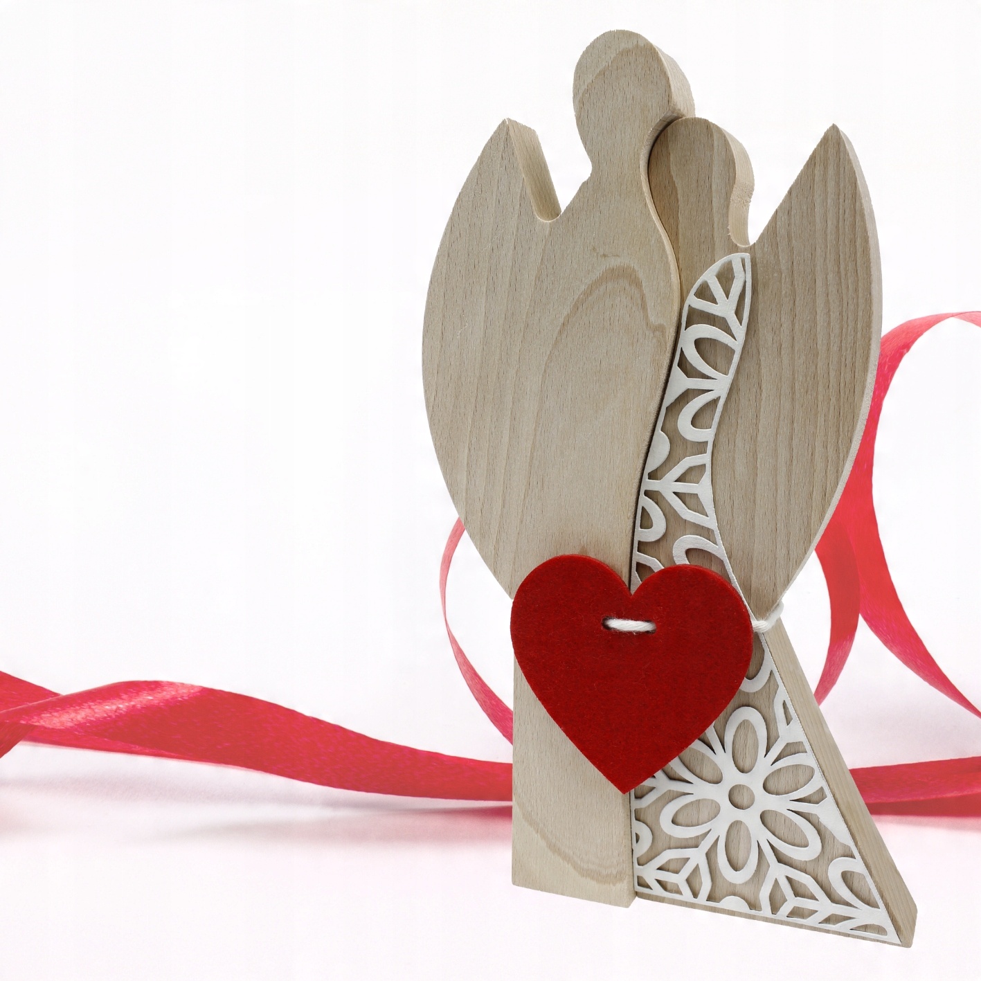 - Два Ангела, высота 26 см, толщина 2,5 см. Ангелочки изготовлены из древесины бука, перевязаны веревкой с эмблемой в виде сердечка из фетра. Ангел, символизирующий женскую фигуру, дополнительно украшен платьем из пивного коврика.