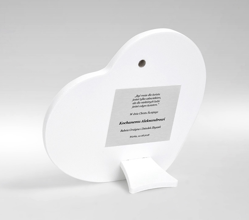 Посвященная табличка размещается на обратной стороне серебряной картины и выполнена в технике гравировки, что означает, что выбранный вами текст будет напечатан на тонкой алюминиевой пластине. Техника гравировки гарантирует привлекательный внешний вид тарелки и ее долговечность. И самое главное, он не мешает поверхности серебряной картины, поэтому не становится персонализированным товаром - поэтому вы можете вернуть его в течение 14 дней без объяснения причин.