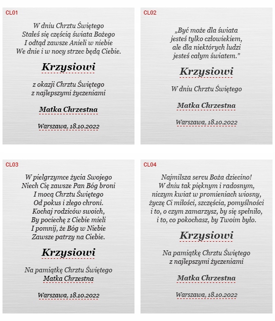 Вы можете выбрать один из вышеуказанных дизайнов, указав только выбранный номер и данные (подчеркнутые с красной линией), который следует изменить, или вы можете отправить свой полный текст. Вы также можете выбрать рисунок изображения, который можно разместить рядом с содержимым посвящения.
