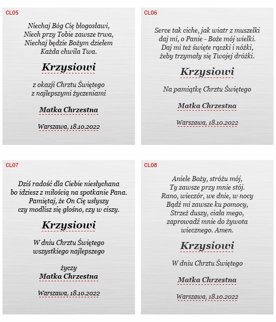 Вы можете выбрать один из шаблонов ниже, указав только выбранный номер и данные (подчеркнутые с красной линией), которые необходимо изменить, или вы можете отправить свой полный текст. Вы также можете выбрать рисунок изображения, который можно разместить рядом с содержимым посвящения.