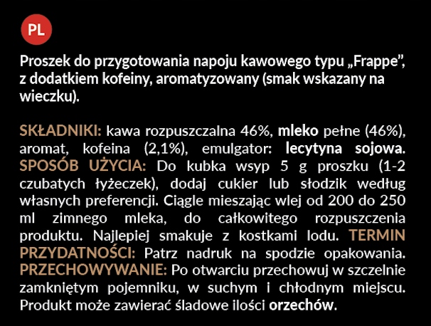 Frappe "Angel's Touch" - это кофейная смесь в порошке для холодной подготовки, с очень высоким содержанием кофеина - 200 мг в части! Теперь в новом выпуске этого божественного напитка мы удивляем вас на 50% больше продукта в упаковке - 150 г!