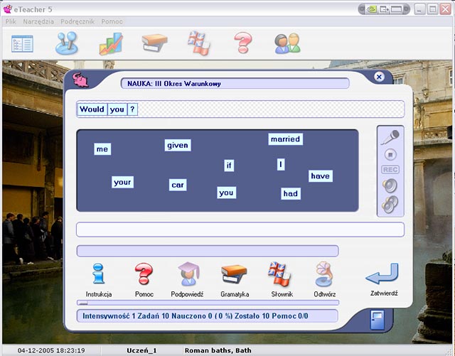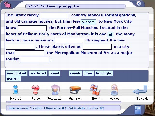 Как и предыдущие версии, это программа упражнений и испытаний. Поэтому это не систематический языковой курс в виде последующих уроков, а содержащий очень богатый набор упражнений и тестов для всех уровней продвижения, от начального до профессионального, которые очень эффективно поддерживают и делают изучение английского языка в школе, на уровне владения языком. языковые курсы или в университете более привлекательны. Это также может быть полезным подспорьем для человека-самоучки. Это также неоценимая помощь при подготовке к различным экзаменам (Matura, FCE, Proficiency и т. д.). В программу также входит словарь и руководство по грамматике английского языка.