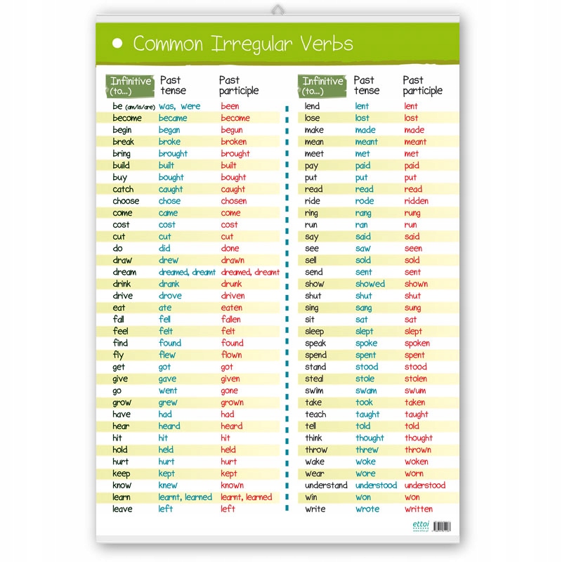 Образовательный плакат A1, представляющий список популярных английских неправильных глаголов с их конкретной формой II (прошедшее время) и III (причастие прошедшего времени).