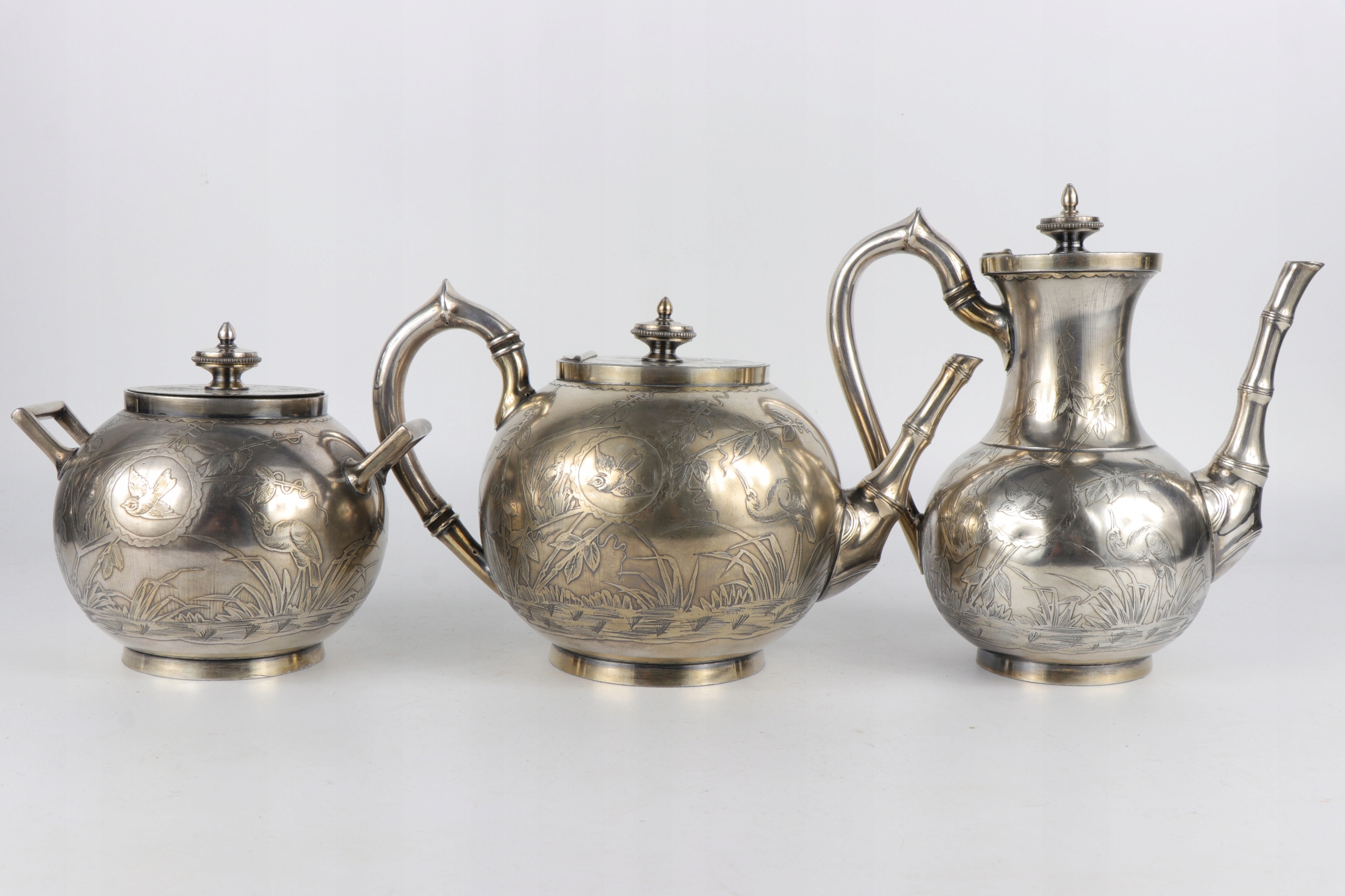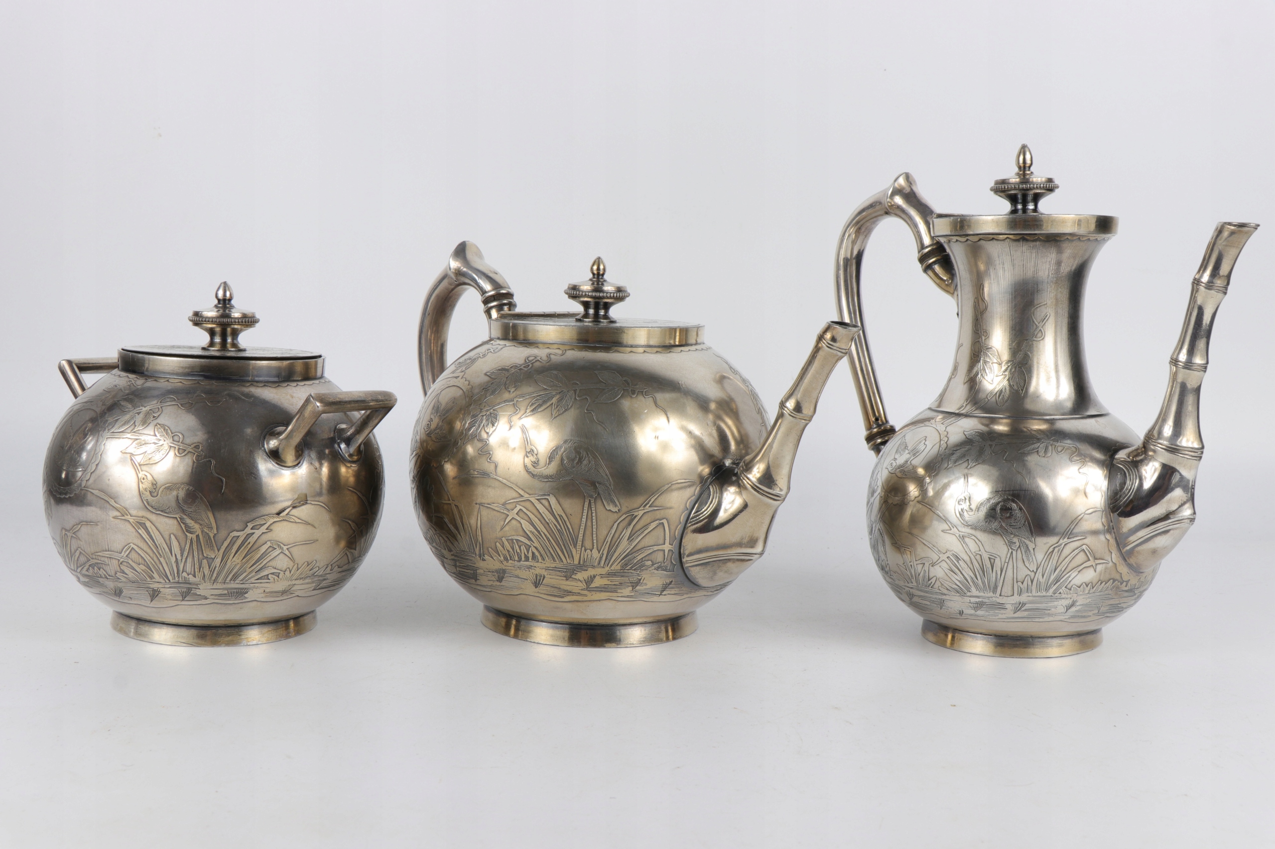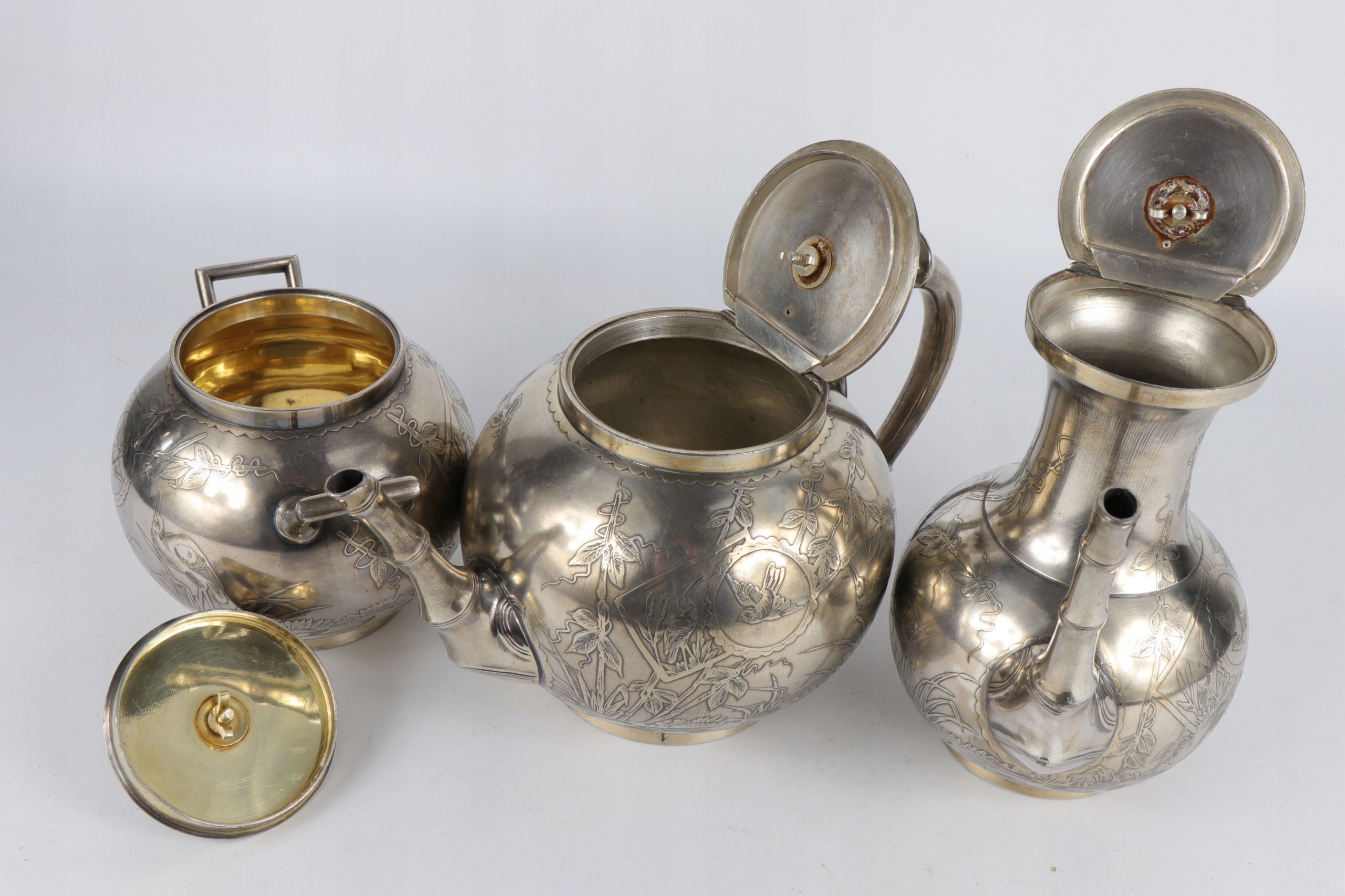Интересный английский чайный набор, украшенный восточным японским образцом японского узора главы оформления птиц между бамбуковым ландшафтом. Дзиубки кувшины стилизованы как бамбуковые стебли. Прекрасное орнамент облегчения очень точно сделан. Внутренняя сахарная чаша. Plater on Brass подписан с The Atkin Brothers Shiffield Sign