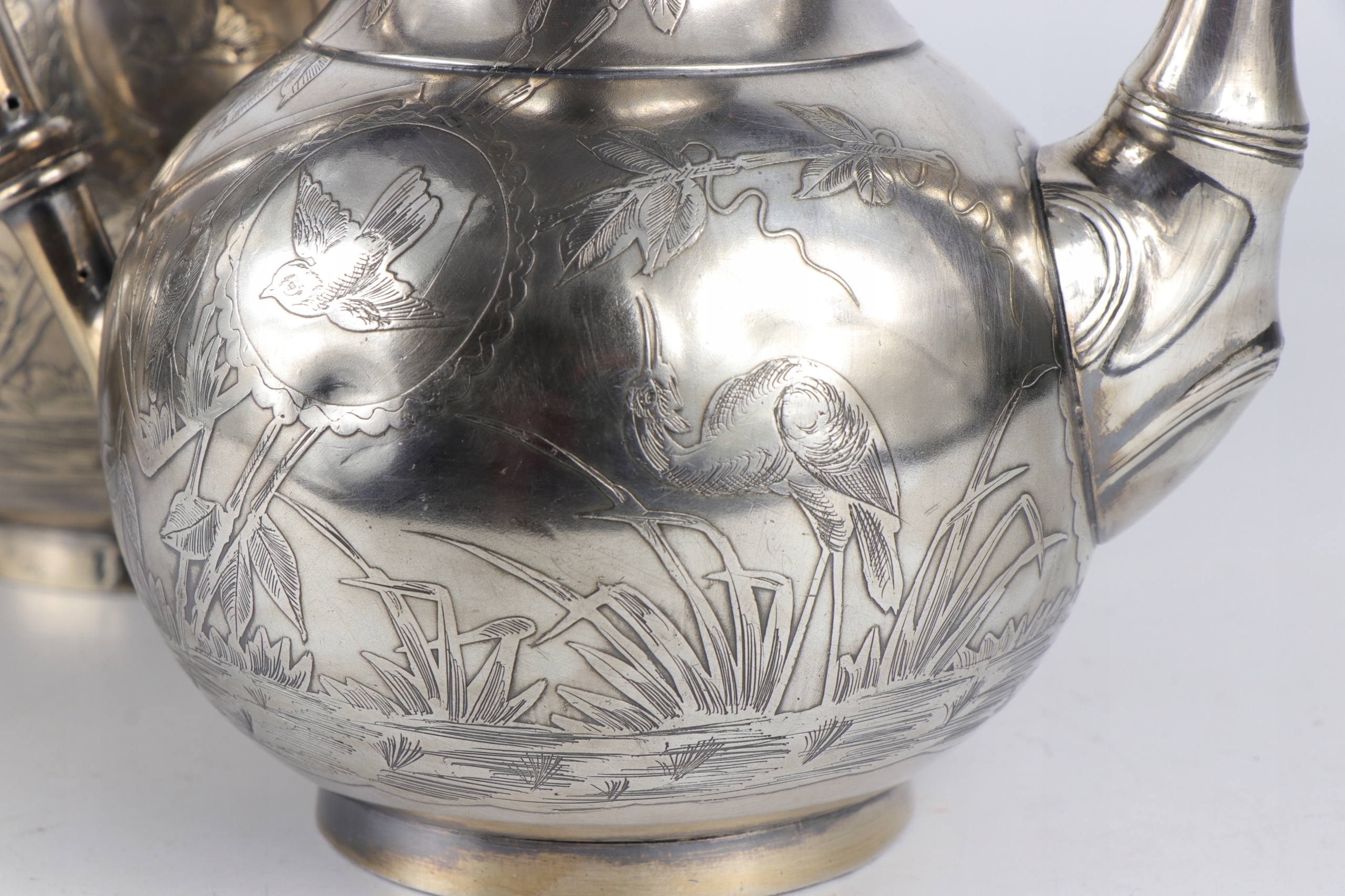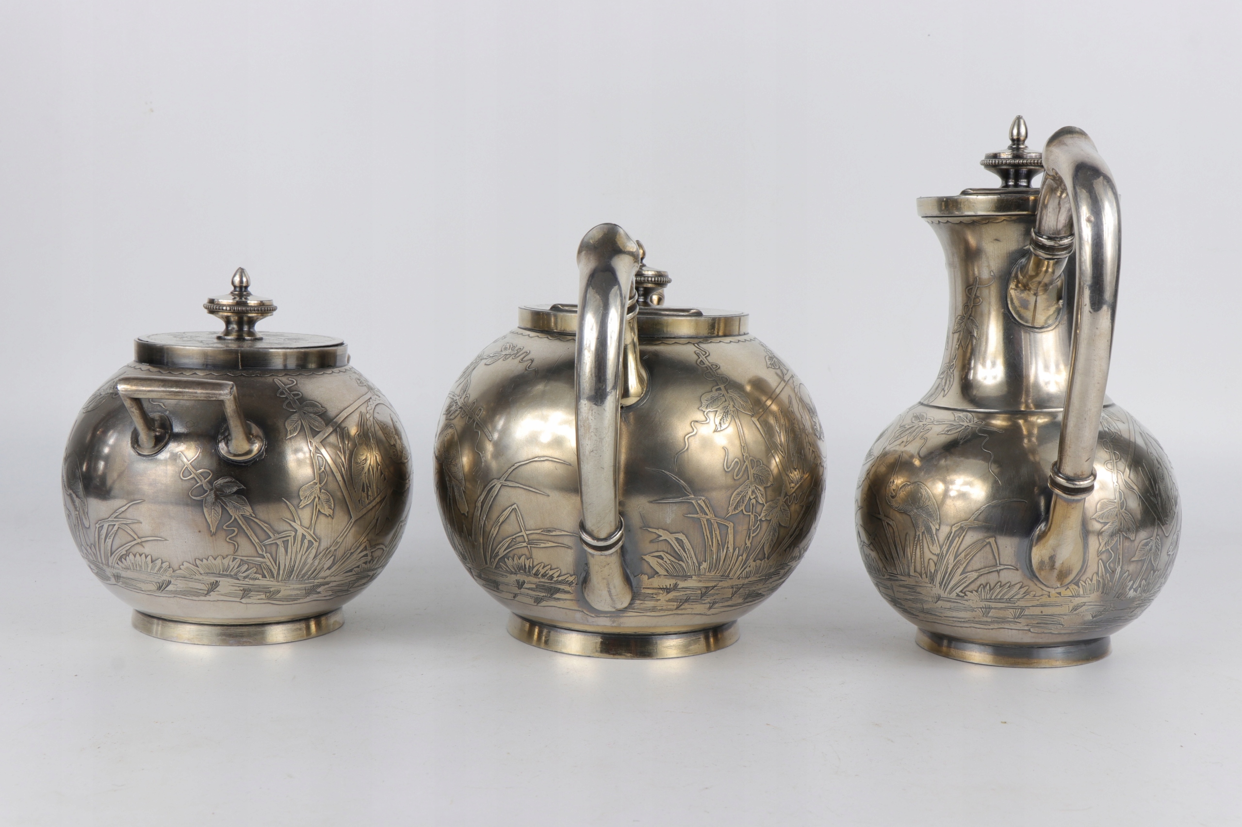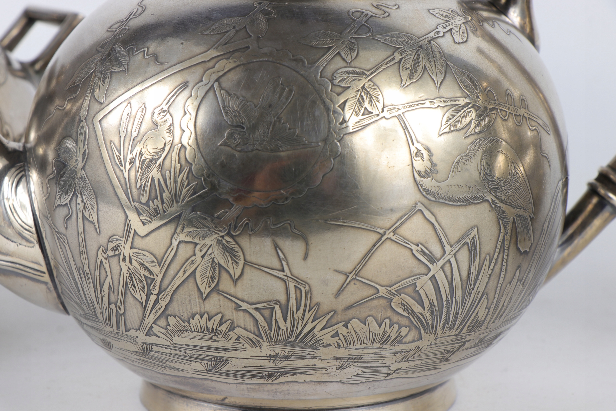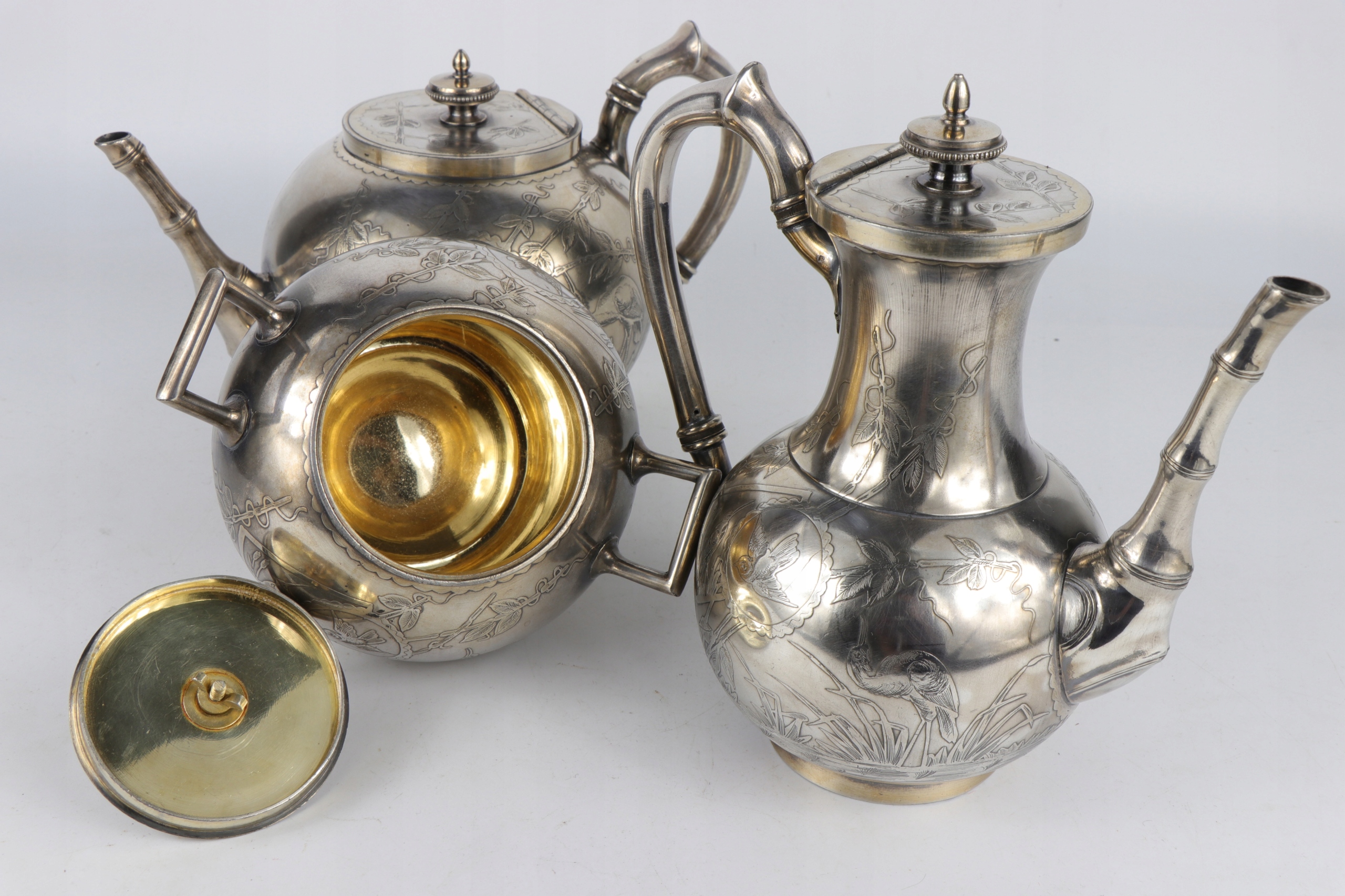 Интересный английский чайный набор, украшенный восточным японским образцом японского узора главы оформления птиц между бамбуковым ландшафтом. Дзиубки кувшины стилизованы как бамбуковые стебли. Прекрасное орнамент облегчения очень точно сделан. Внутренняя сахарная чаша. Plater on Brass подписан с The Atkin Brothers Shiffield Sign