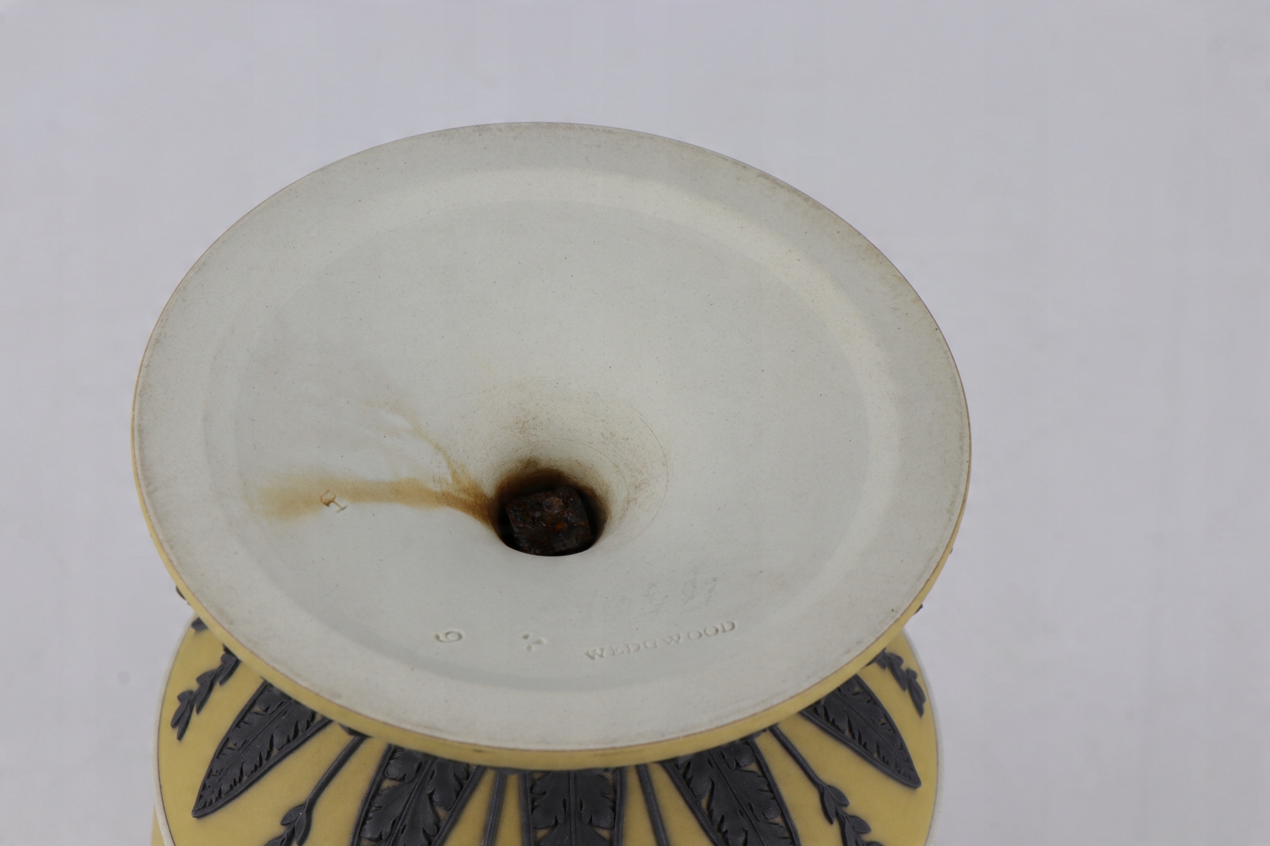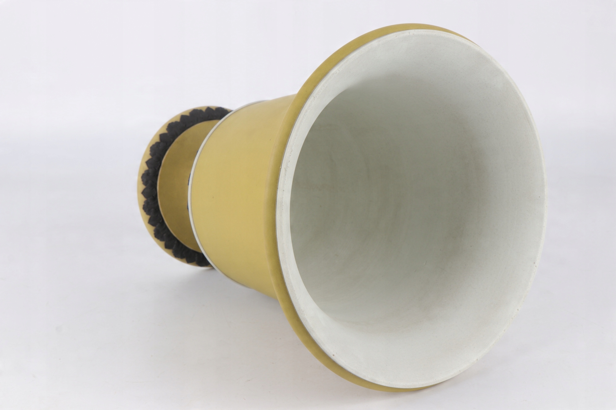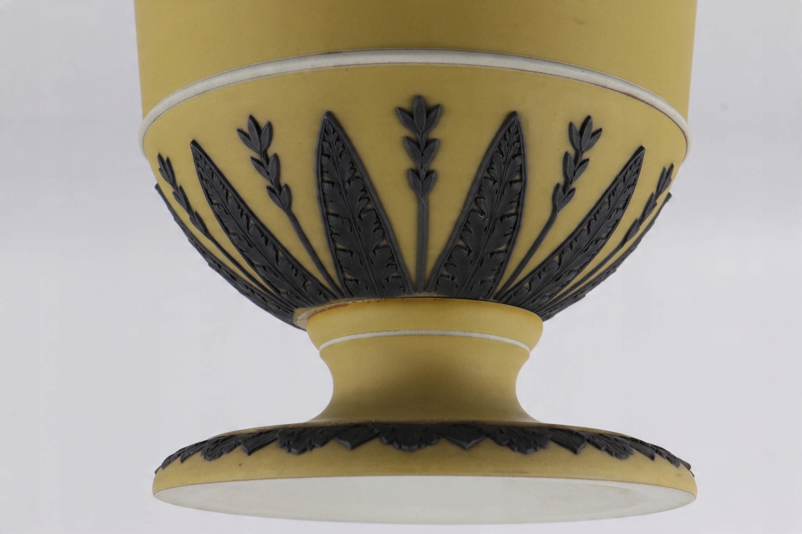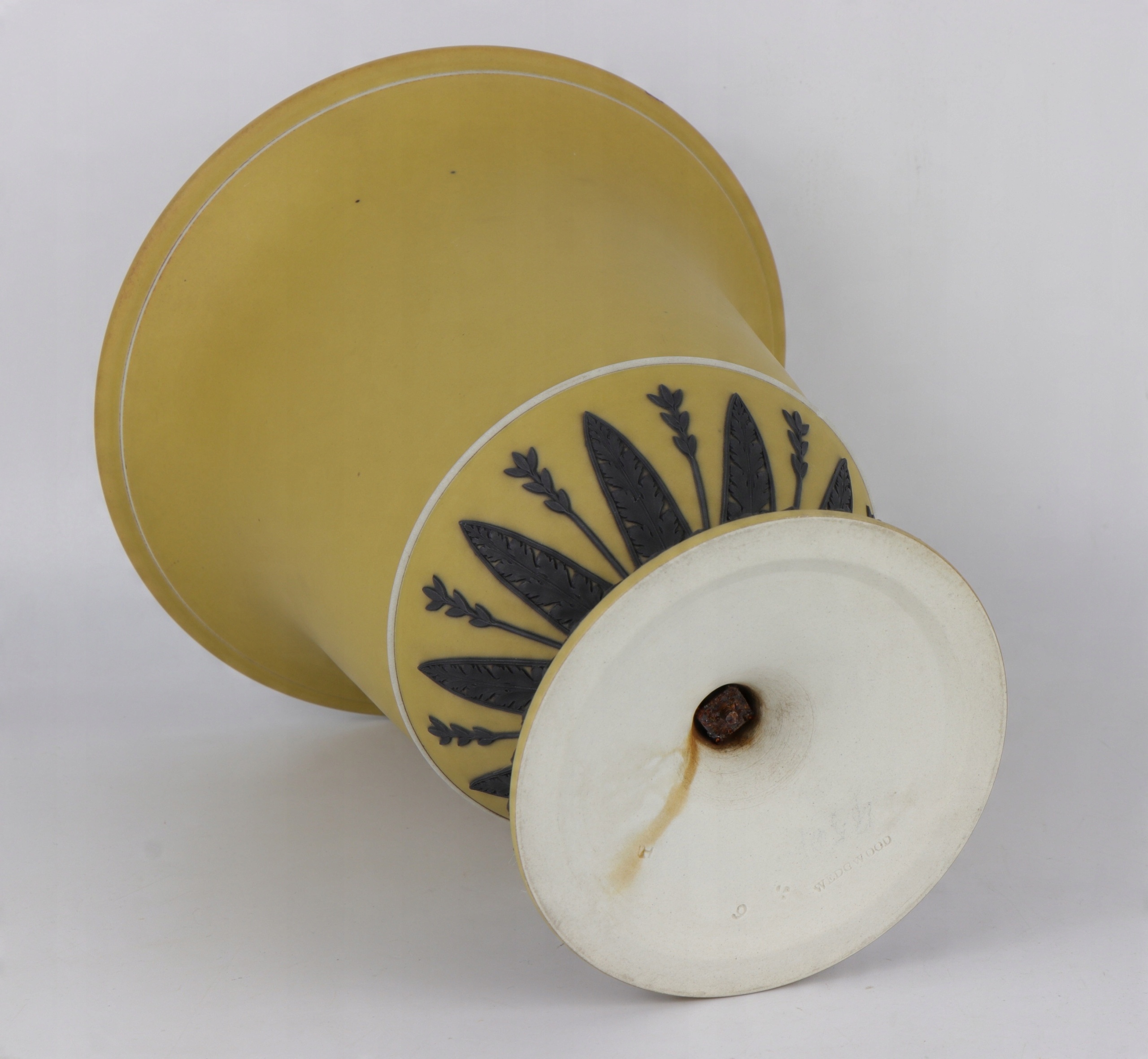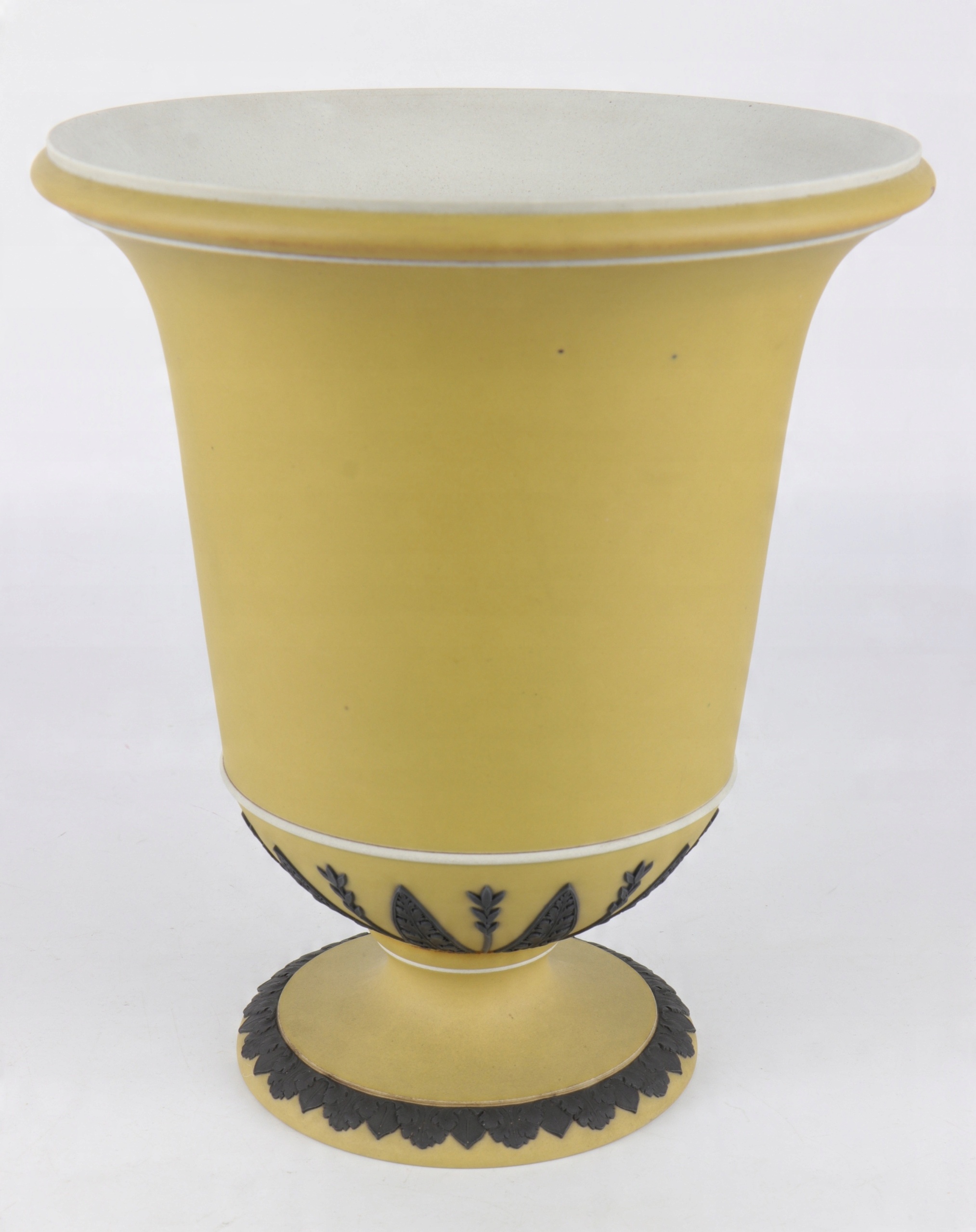 Очень редкая желто-черная фарфоровая ваза в форме греческого кратера. Фарфор конца 18 века, подписанный очень редкой формой клейма Веджвуда, использовавшейся очень короткое время около 1790 года. Желтый, слегка горчичный цвет, кратеры с черными аппликациями в характерной форме листьев. Черные аппликации, выполненные с непревзойденной точностью, очень редко встречаются в изделиях XIX и XX веков.