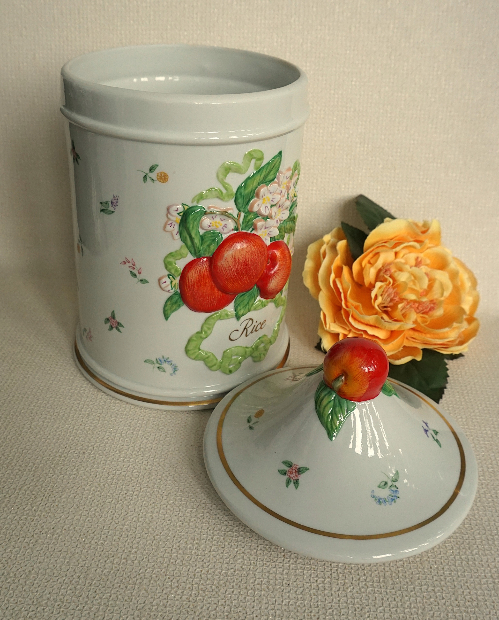Контейнер является воплощением английского стиля. Красочный, большой, богато украшенный цветочными мотивами и мотивом сладкого яблока: на брюшке и на крышке.