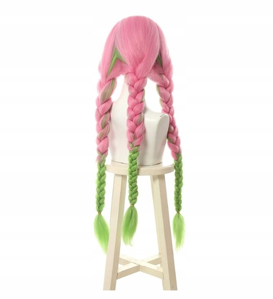 - Парик с тремя косами, розовый с зелеными кончиками,