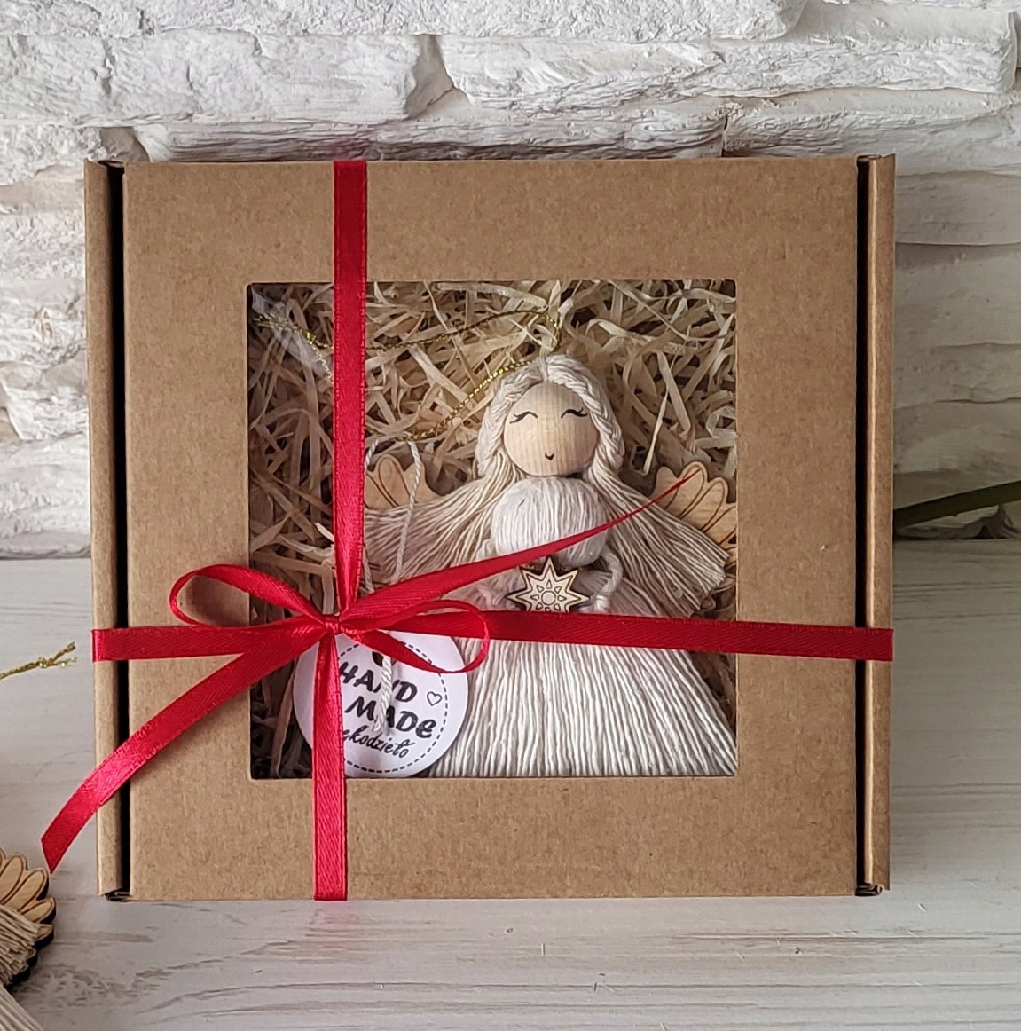 ANIOŁEK MAKRAMA W PUDEŁKU Z OKIENKIEM NA PREZENT POD CHOINKĘ PAMIĄTKA