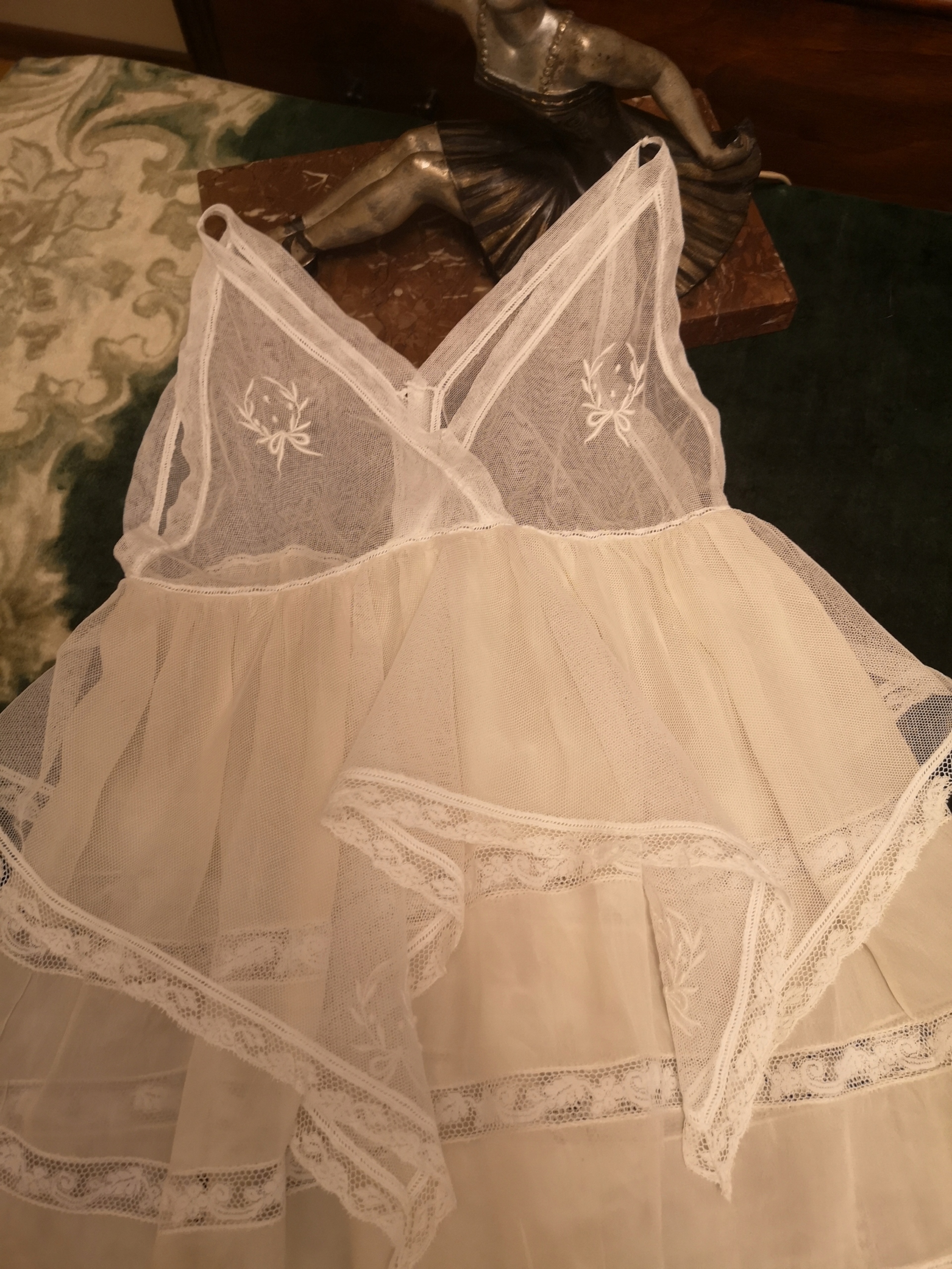 Красивое довоенное платье; белый тюль с вышивкой и шелк цвета экрю в сочетании с кружевом. Ткань была обновлена, все еще прочная, в довольно хорошем состоянии. Тюль без каких-либо оговорок, никаких дефектов на нем я не заметила. На шелке есть крошечные дырочки (последние четыре фото) и размытые пятна. Шелк во многих местах выглядит мокрым, и это видно в зависимости от освещения. Размеры: окружность шеи 54 см, высота. 52 см. Приглашаю вас принять участие в торгах и на других моих аукционах.