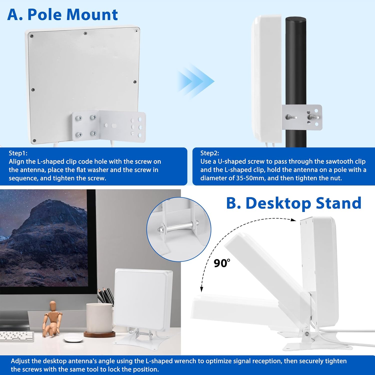 Полный комплект с гибким креплением: включает антенну, 3-метровый кабель SMA, Адаптер TS9, настольное крепление и крепления для мачты. Легко устанавливается на стены, столы или столбы без специальных инструментов.
