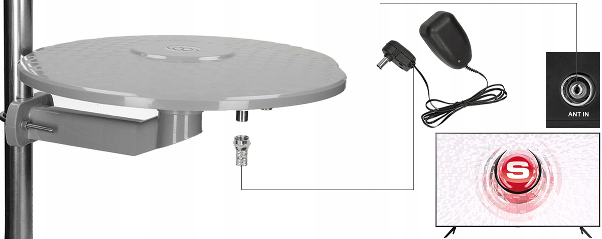 Антенна DVB-T2 поставляется с разъемом типа F, готовым для установки на коаксиальный кабель, например. источник питания, обеспечивающий правильную работу встроенного в антенну усилителя. Для правильной работы антенны коаксиальный кабель должен быть правильно установлен внутри вилки питания антенны. Затем подключите блок питания к блоку питания, а вилку антенны — к разъему RF-IN (Antenna IN) на ТВ-приемнике или к внешнему тюнеру DVB-T/DVB-T2.