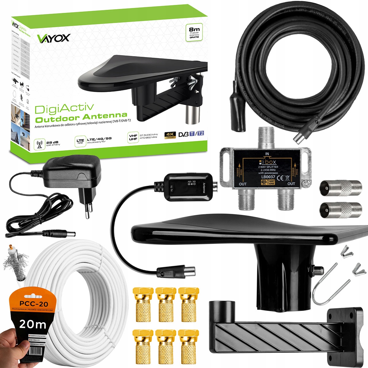 Антенна была разработана Plock Brand Vayox для польского рынка b> благодаря которой она отлично работает в наших условиях. предназначен для получения сигналов цифрового наземного телевидения dvb-t2 в этом mux8 в UHF и VHF . Дизайн антенны обеспечивает даже подкрепление полученные сигналы на полной частоте. Активная антенна посвящена областям с различными условиями принятия. Радиус приема - это расстояние ок. 100 км от радиовещательной станции, конечно, прием зависит от мощности сигнала в данной области
