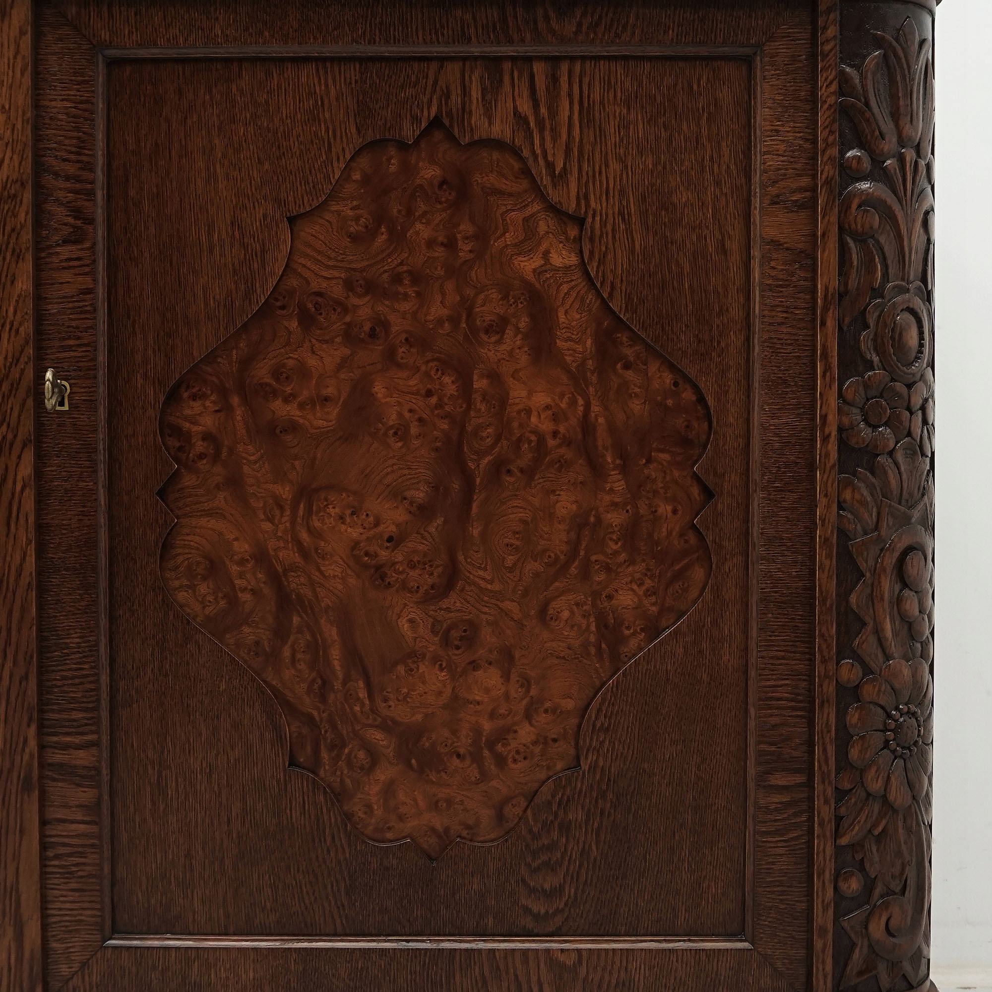 Этот уникальный комод в межвоенном стиле восхищает мастерством исполнения и богатством деталей. Фасады украшены эффектными аппликациями из древесины ореха с красивой текстурой, которые придают мебели неповторимый характер. Резные украшения по бокам и ажурная ажурная галерея в верхней части подчеркивают стиль эпохи.