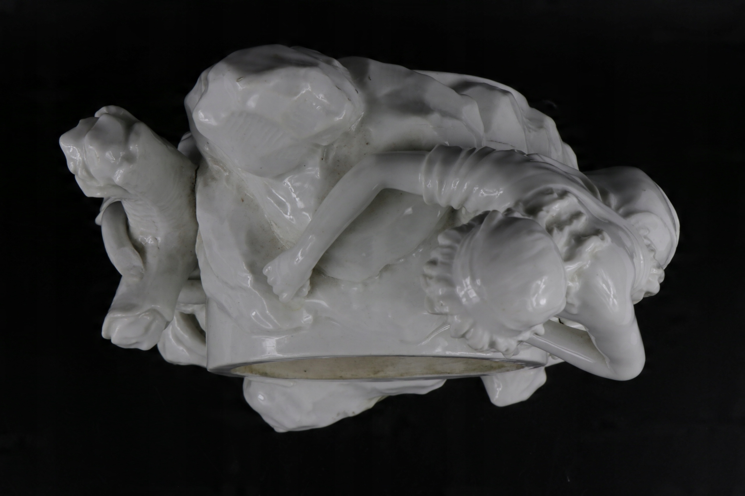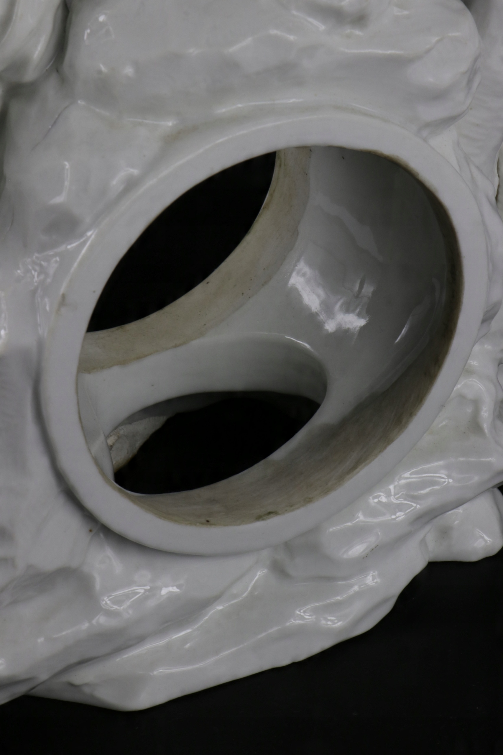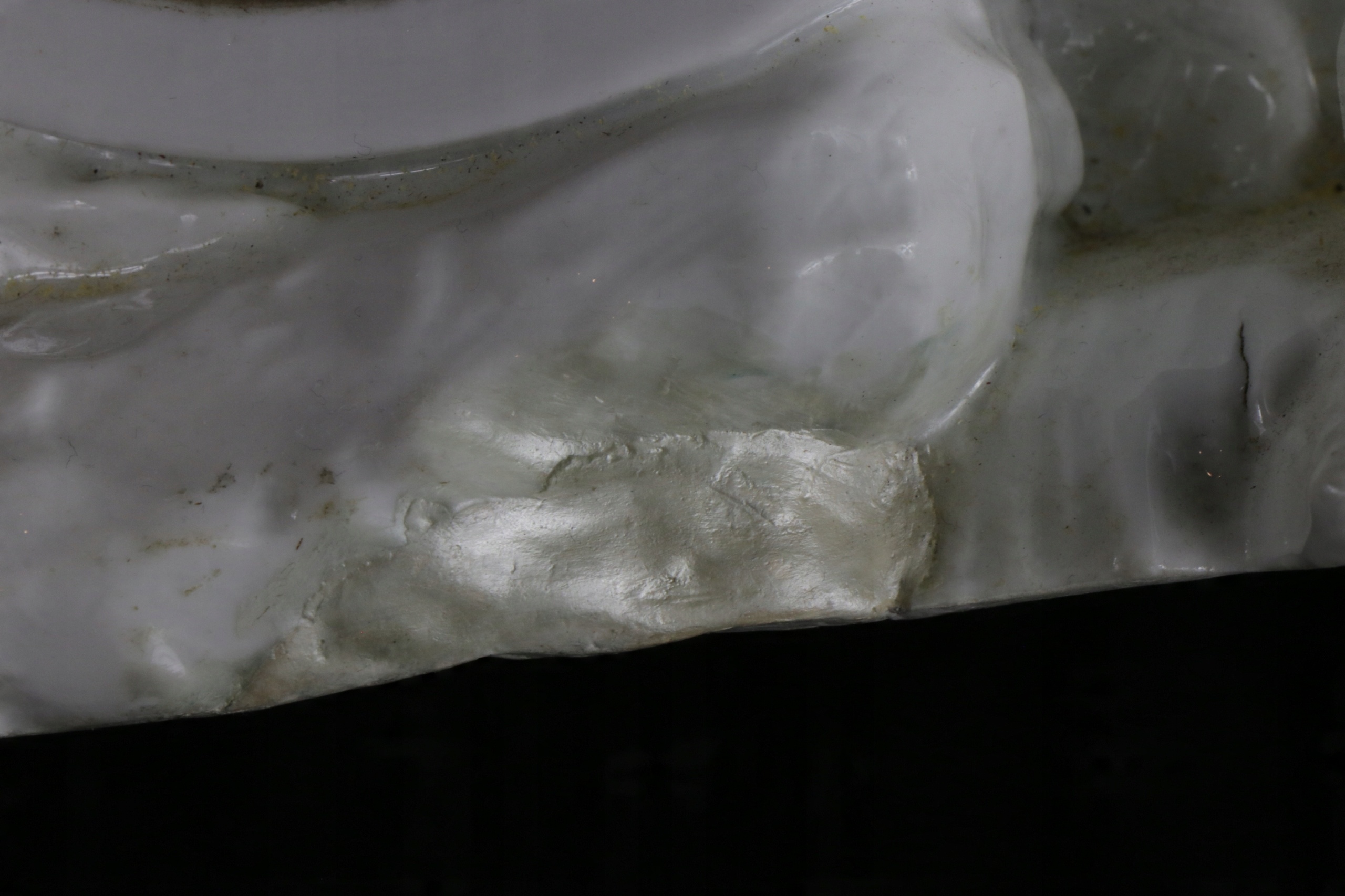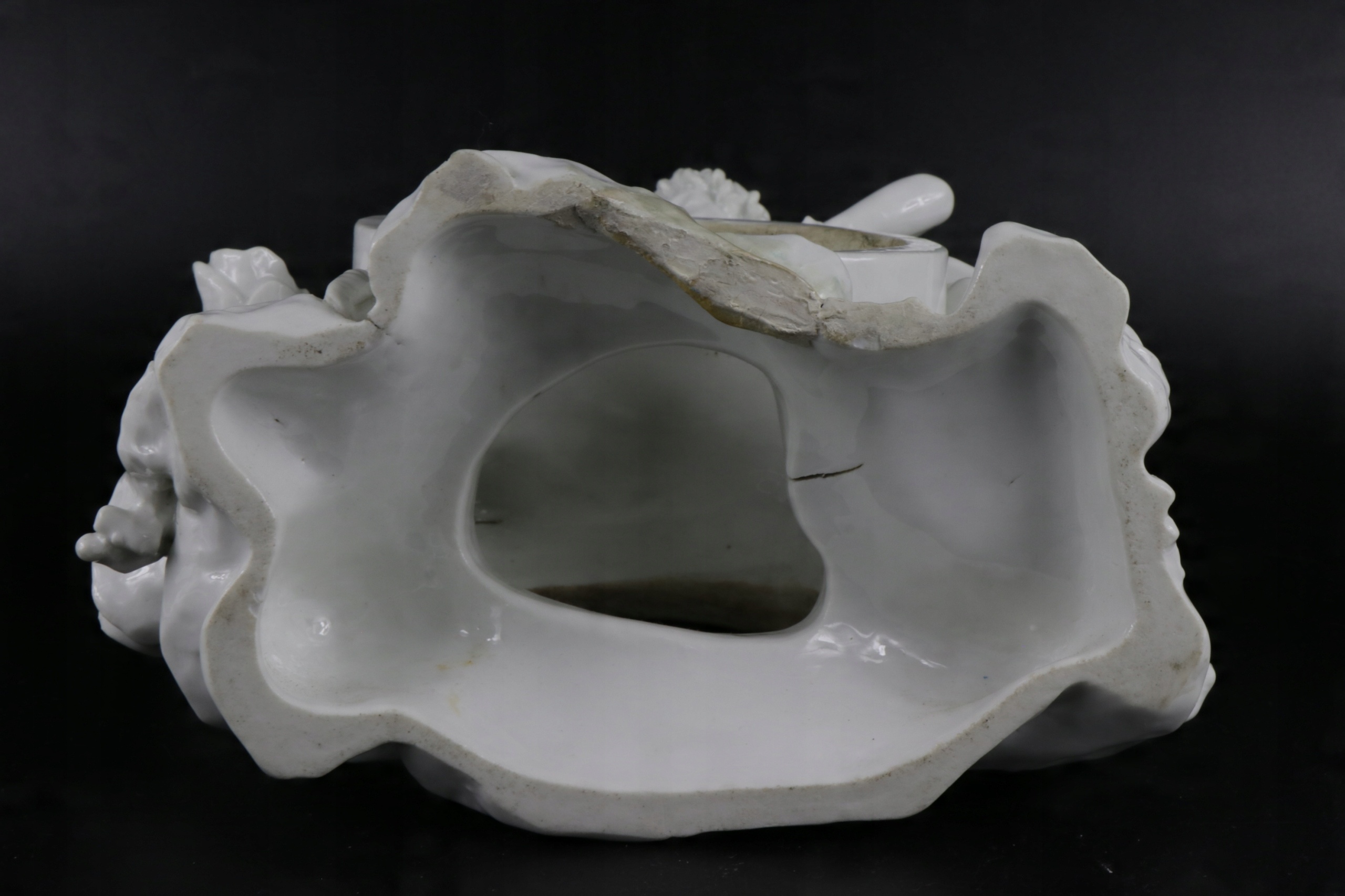 Как видно на фотографиях. Фарфор поврежден, отсутствует небольшой фрагмент змеи, вьющейся по ветке с левой стороны фигуры, заполнен фрагмент дефекта в основании. Место для установки часов выглядит так, как будто оно немного утоплено спереди и не имеет круглой формы.