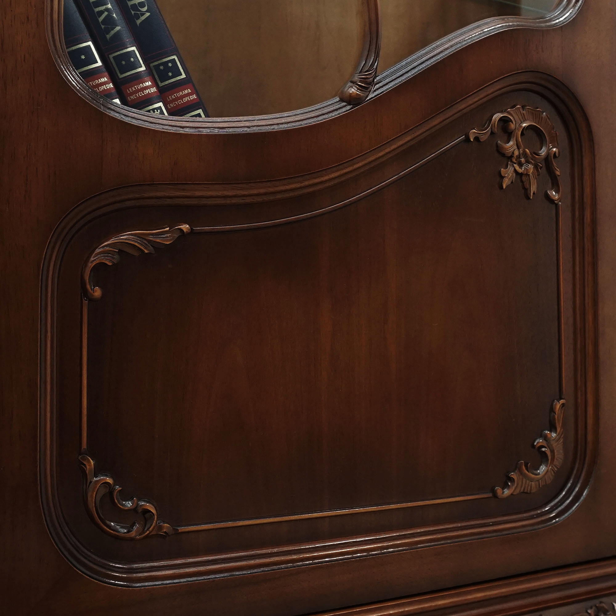 Аккуратно согнутые ноги, декоративные применения в рамках резки на дереве, и тонко профилированные фронты фронтов придают легкость мебели и классическое очарование. Застекленные двери с декоративными зазорами обнажают внутреннюю часть, оборудованную стеклянными полками - идеально подходит для представления фарфора, стекла, антиквариата или элегантных аксессуаров.