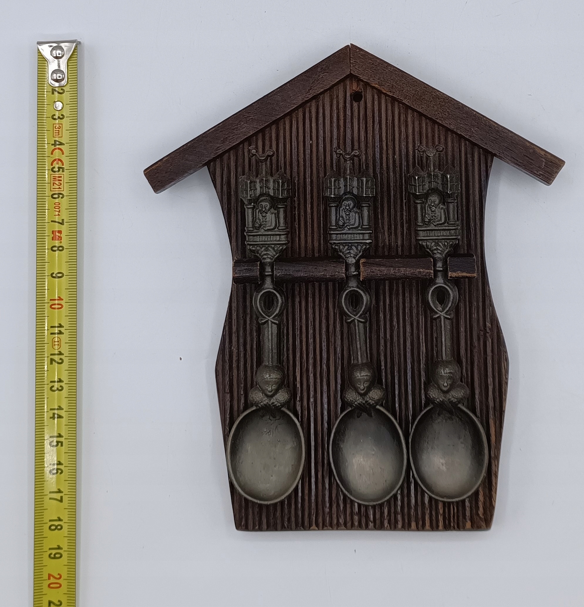 Антикварные оловянные ложки с подписью на деревянной вешалке - предмет коллекционирования.