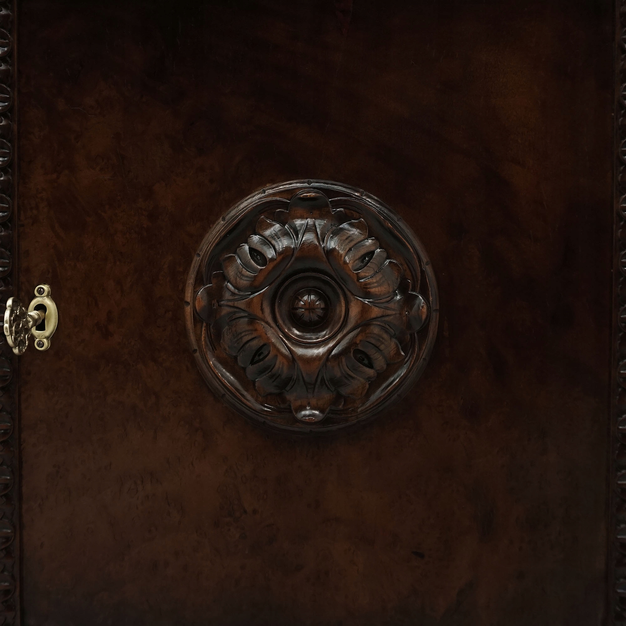 Расположенные по центру розетки на фасадах дверей подчеркивают симметрию и классическую гармонию композиции, а четкий профиль и массивное основание на сферических ножках добавляют общее впечатление устойчивости и достоинства.