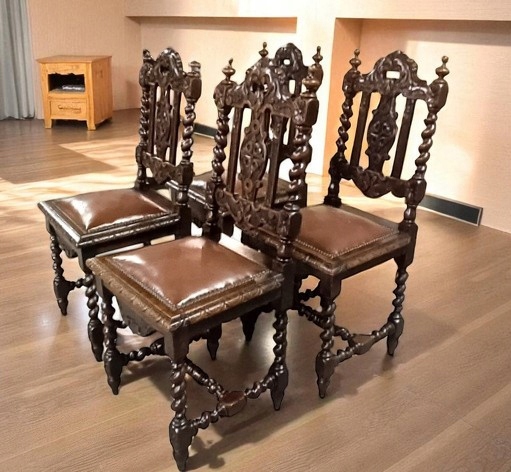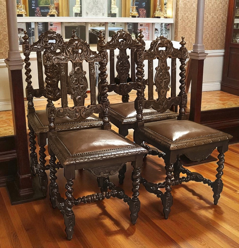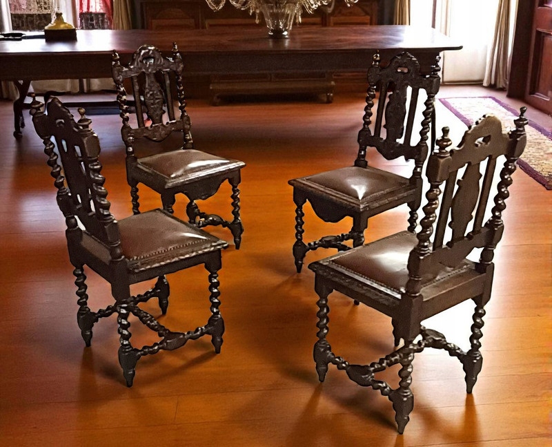 Старинные столовые стулья с богатой резьбой как практичное украшение, создающее античную атмосферу. Мебель б/у, в хорошем состоянии, устойчивая, обивка кожаная с небольшими царапинами, так называемый "зуб времени" - без потертостей и потертостей, соединена с конструкцией декоративными латунными штифтами. Древесина темного ореха с фантастической резьбой.