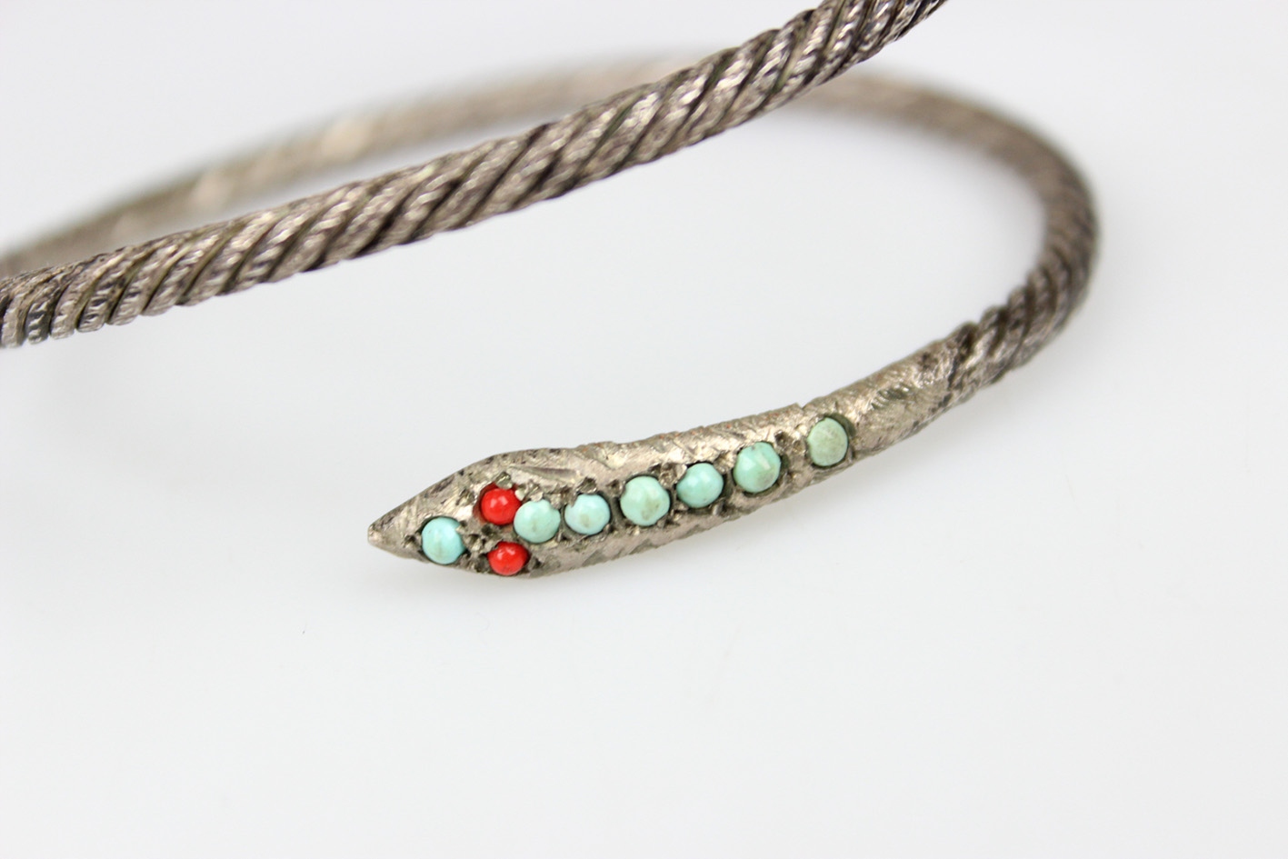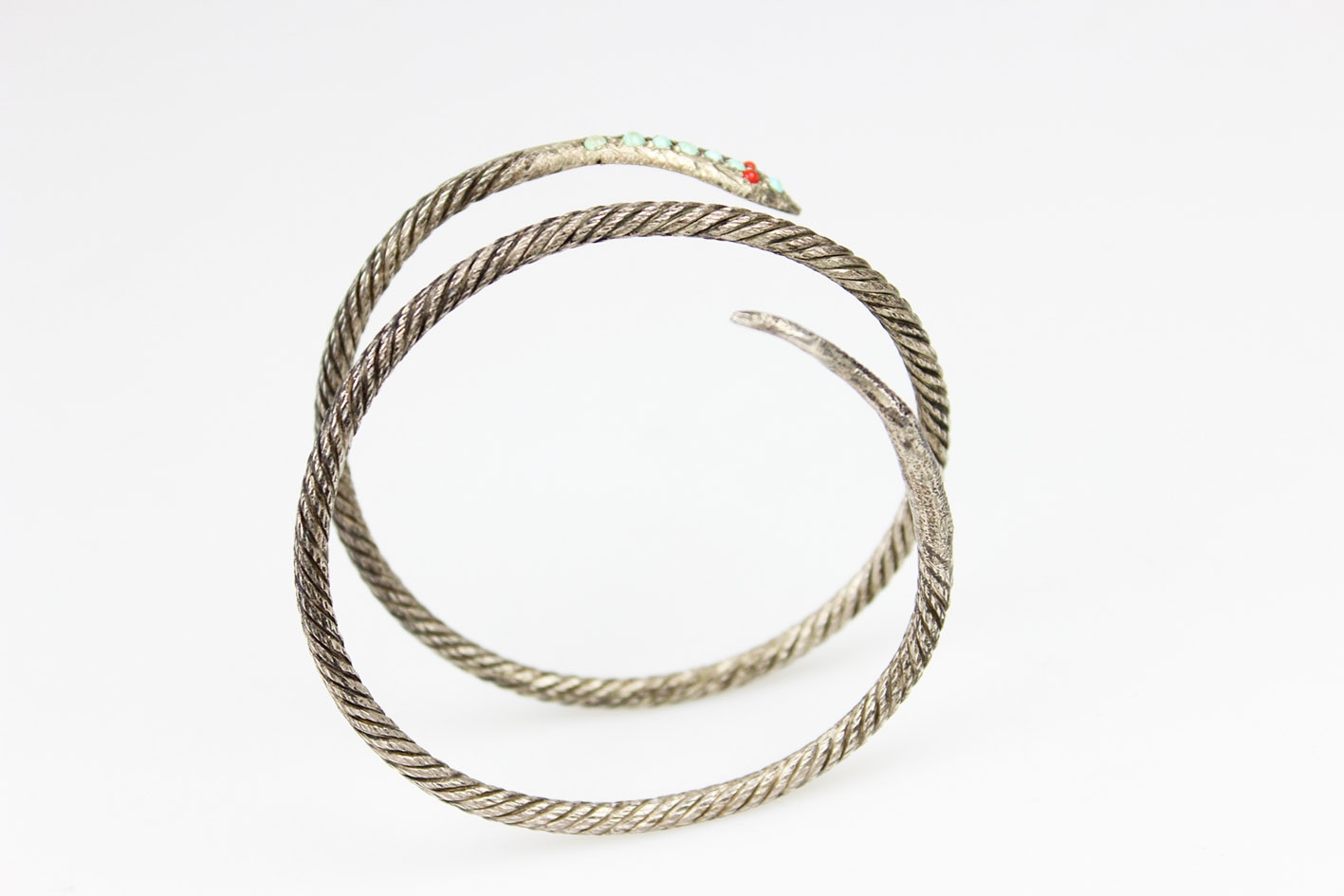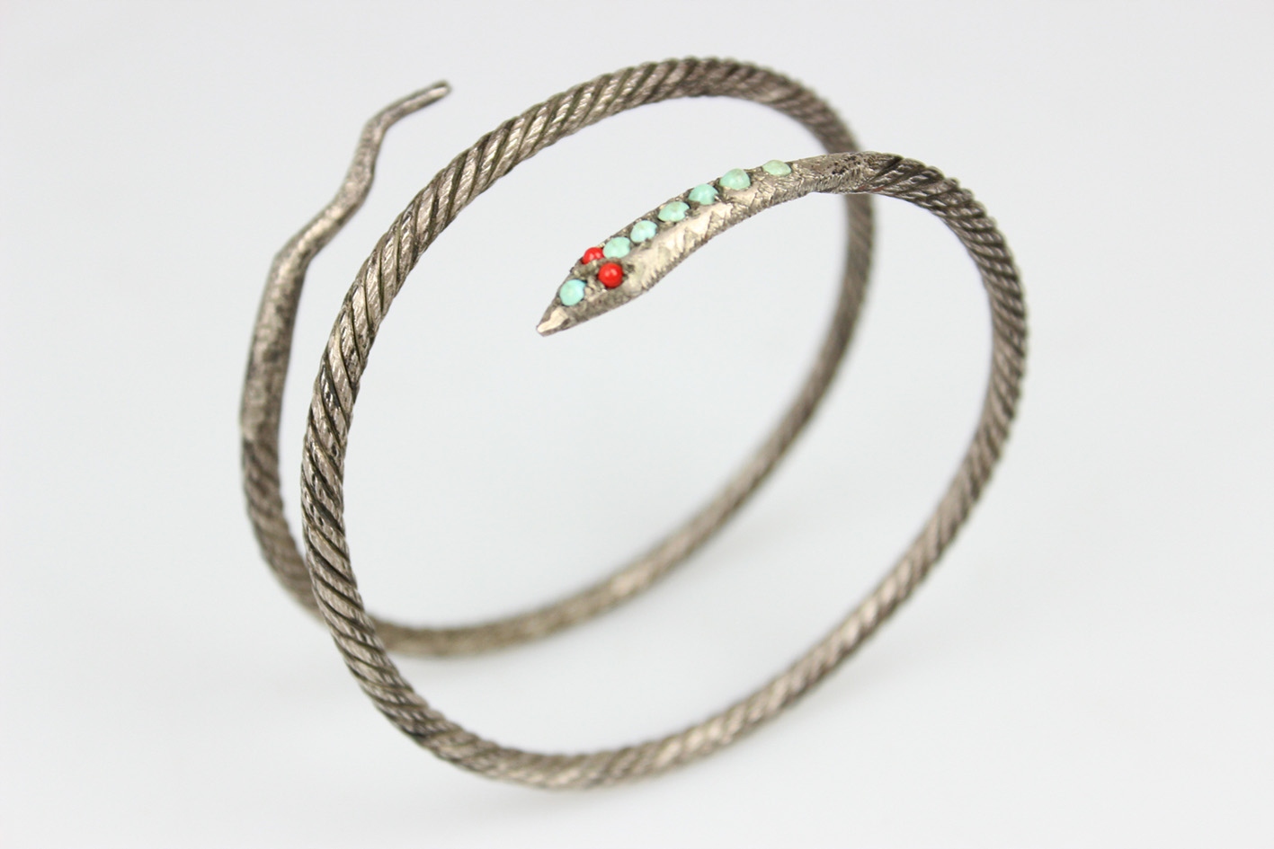 Впечатляющий спиральный браслет 1920-х годов с модным в то время змеиным мотивом, символизирующим возрождение, бдительность и защиту. Посеребренное изделие с красивой фактурной поверхностью, напоминающей витую проволоку, что придает всему изделию характер и слегка индустриальный стиль, характерный для раннего ар-деко. Наконечник в виде головы змеи украшен яркими стеклами, имитирующими бирюзу и коралл, что оживляет дизайн и подчеркивает его экзотичность. Эластичная конструкция, благодаря которой украшение традиционно можно носить как браслет на руку, но не менее эффектно оно смотрится и как браслет на руку, обхватывая руку способом, характерным для моды 1920-х годов. Все покрыто натуральной патиной, которой более 100 лет.