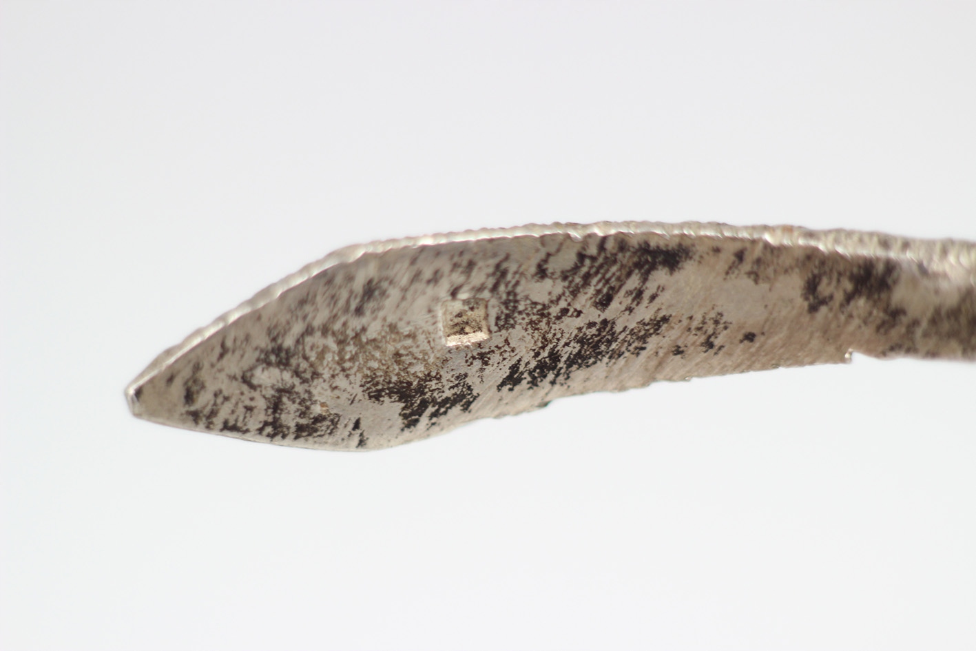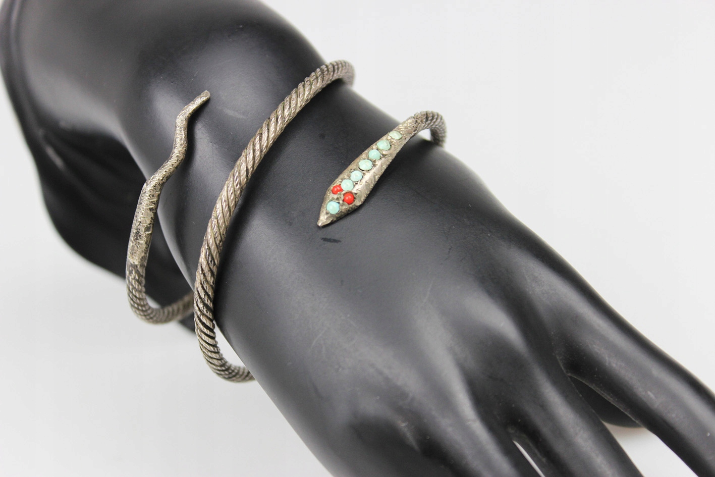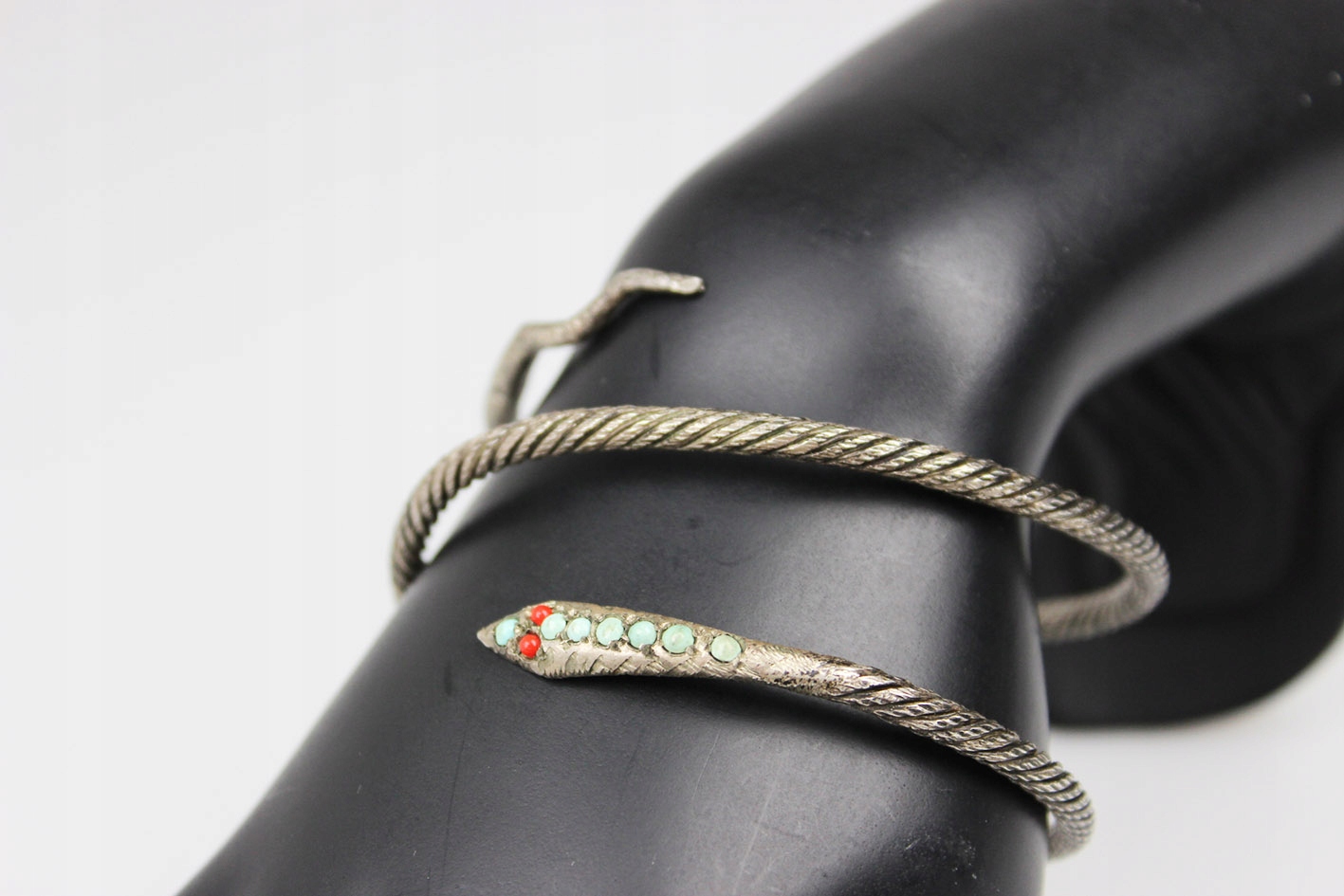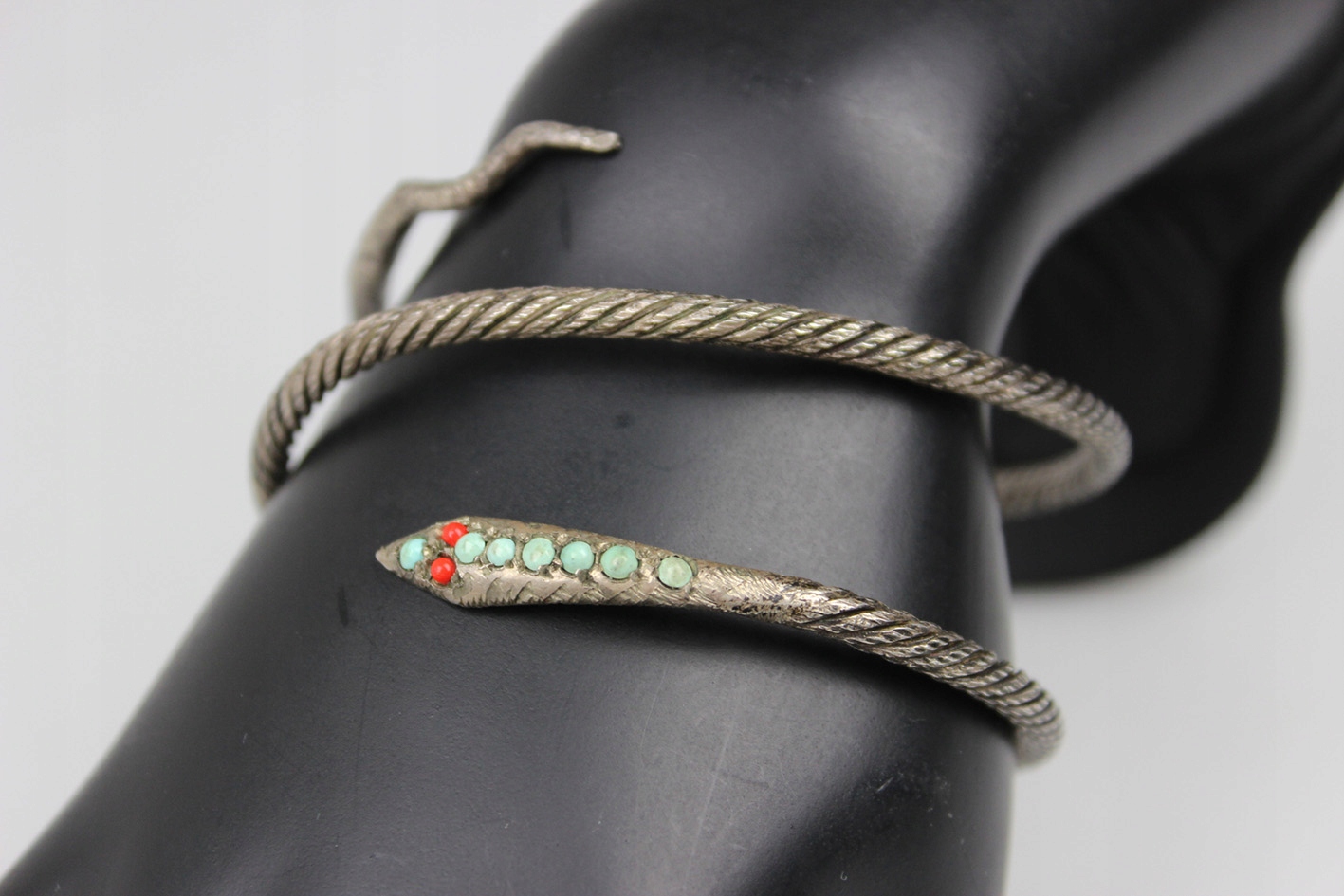 Впечатляющий спиральный браслет 1920-х годов с модным в то время змеиным мотивом, символизирующим возрождение, бдительность и защиту. Посеребренное изделие с красивой фактурной поверхностью, напоминающей витую проволоку, что придает всему изделию характер и слегка индустриальный стиль, характерный для раннего ар-деко. Наконечник в виде головы змеи украшен яркими стеклами, имитирующими бирюзу и коралл, что оживляет дизайн и подчеркивает его экзотичность. Эластичная конструкция, благодаря которой украшение традиционно можно носить как браслет на руку, но не менее эффектно оно смотрится и как браслет на руку, обхватывая руку способом, характерным для моды 1920-х годов. Все покрыто натуральной патиной, которой более 100 лет.